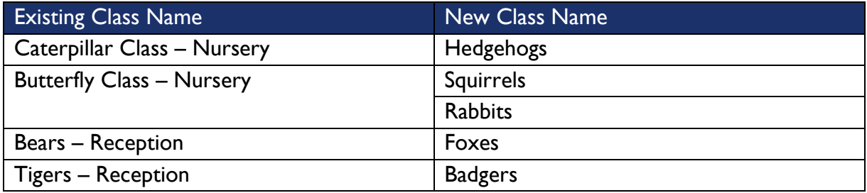 Given the creation of an additional Butterfly Class, the Early Years classes will also be renamed from September 2024. Shown in the table below, these will be different woodland creatures and provide exciting opportunities for links to outdoor learning.