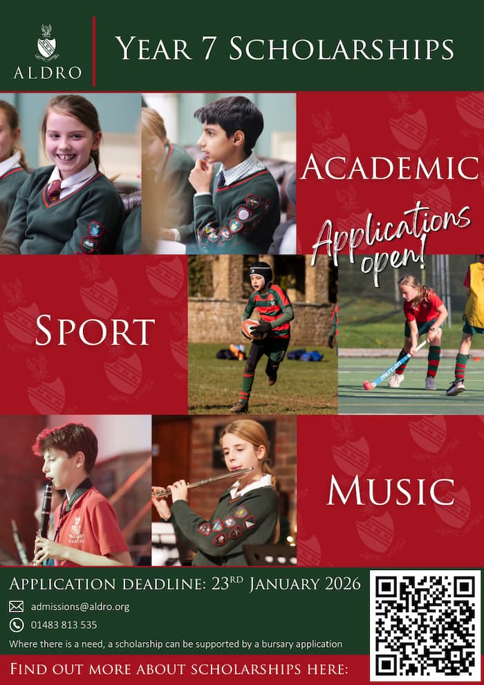 For more information about the scholarship opportunities available or about joining Aldro in Form 7, please contact Mrs Richards on admissions@aldro.org or 01483 813 535.