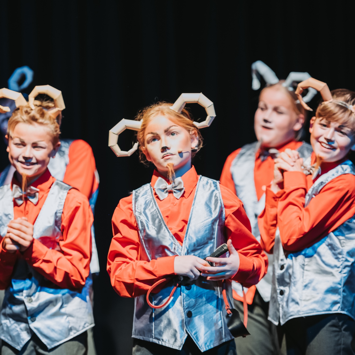 Children acting on stage in orange shirts and silver waistcoats