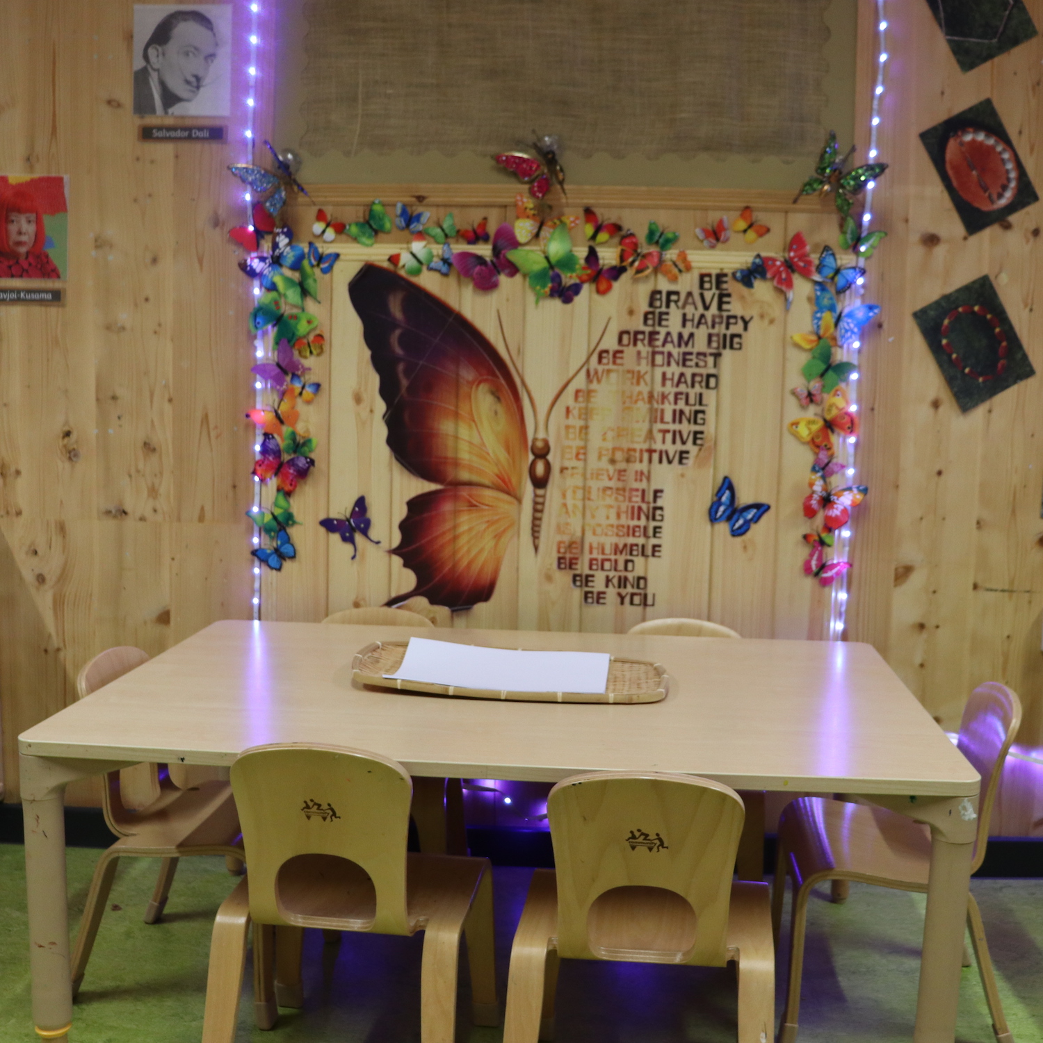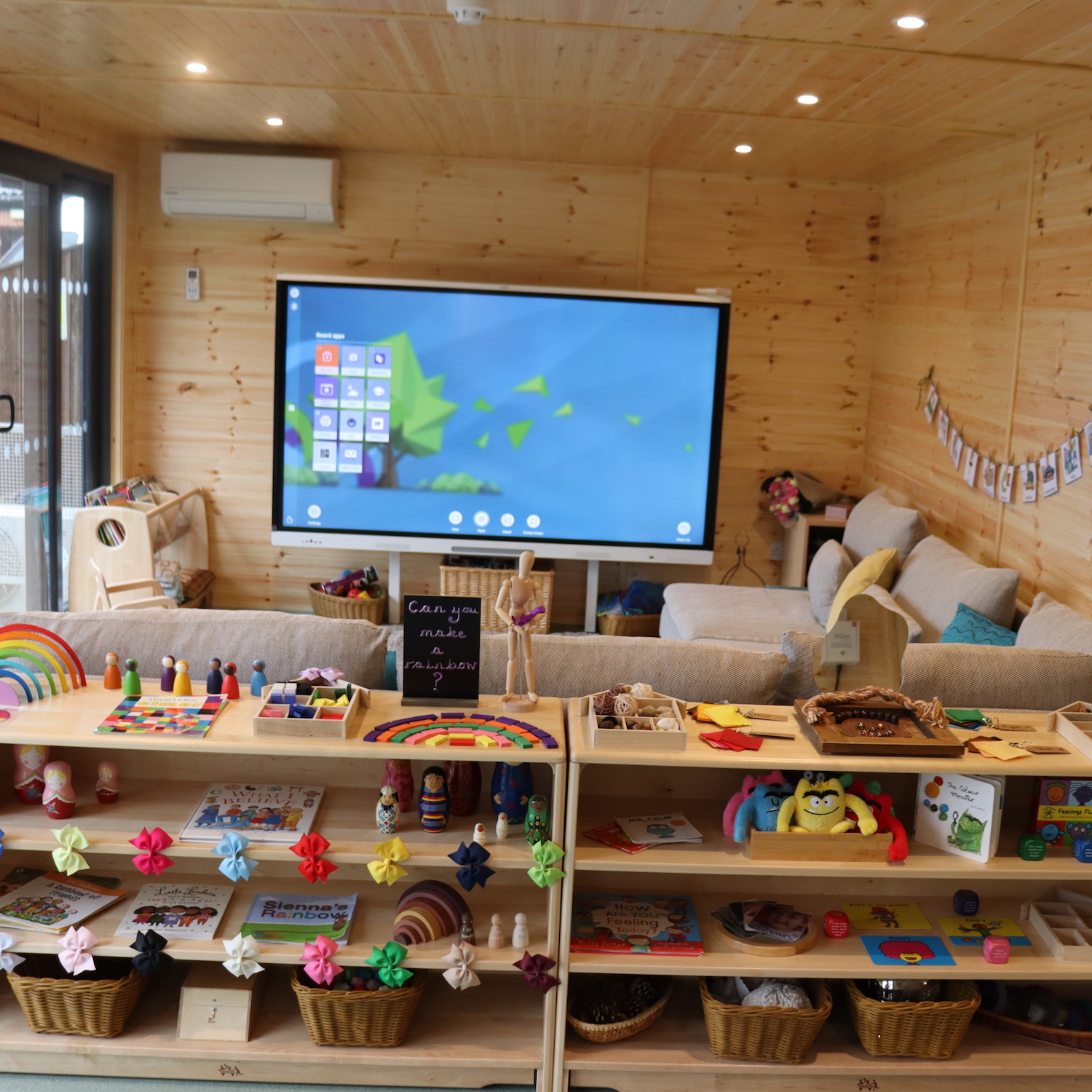 The inside of Hilden Grange nursery with large TV on the wall and big sofas