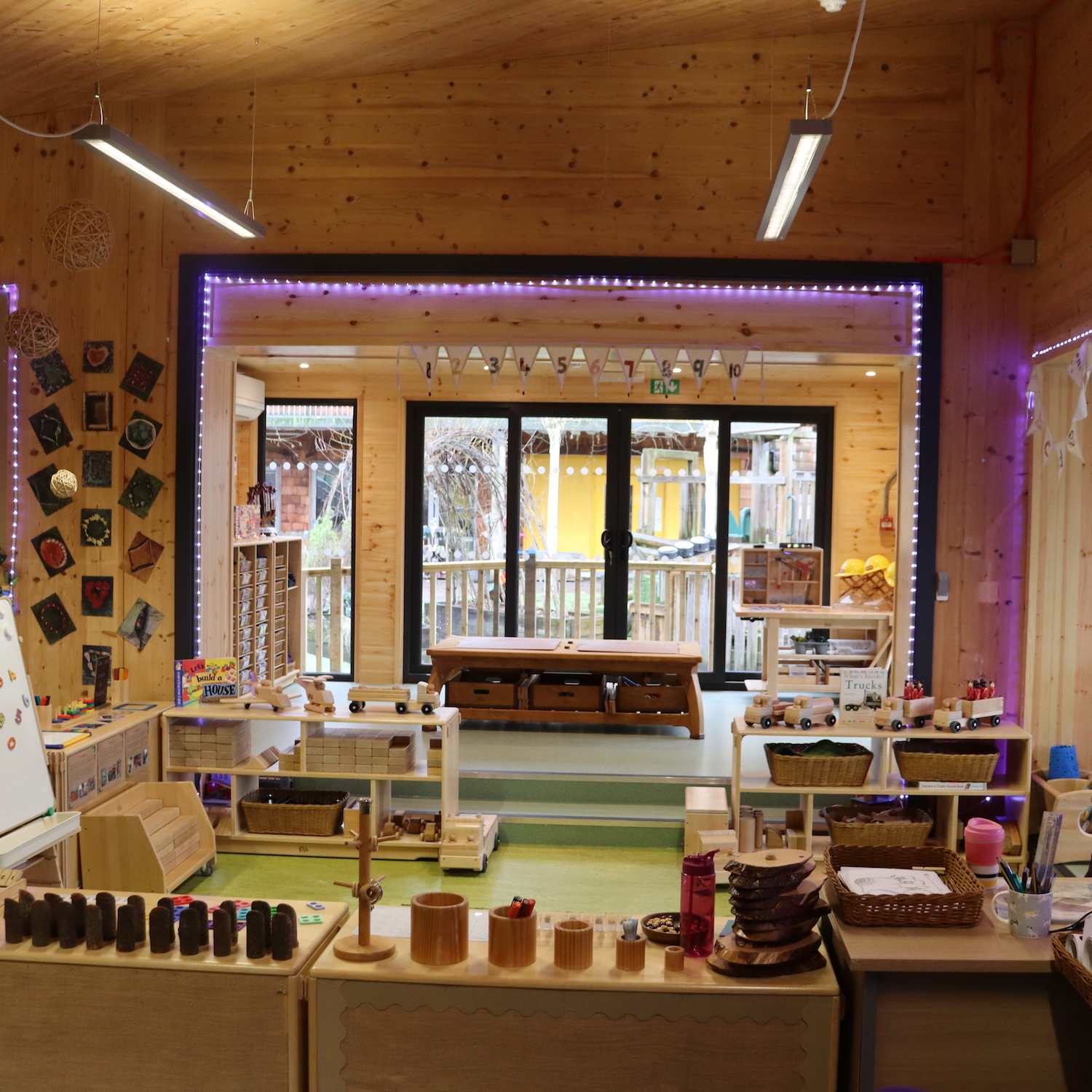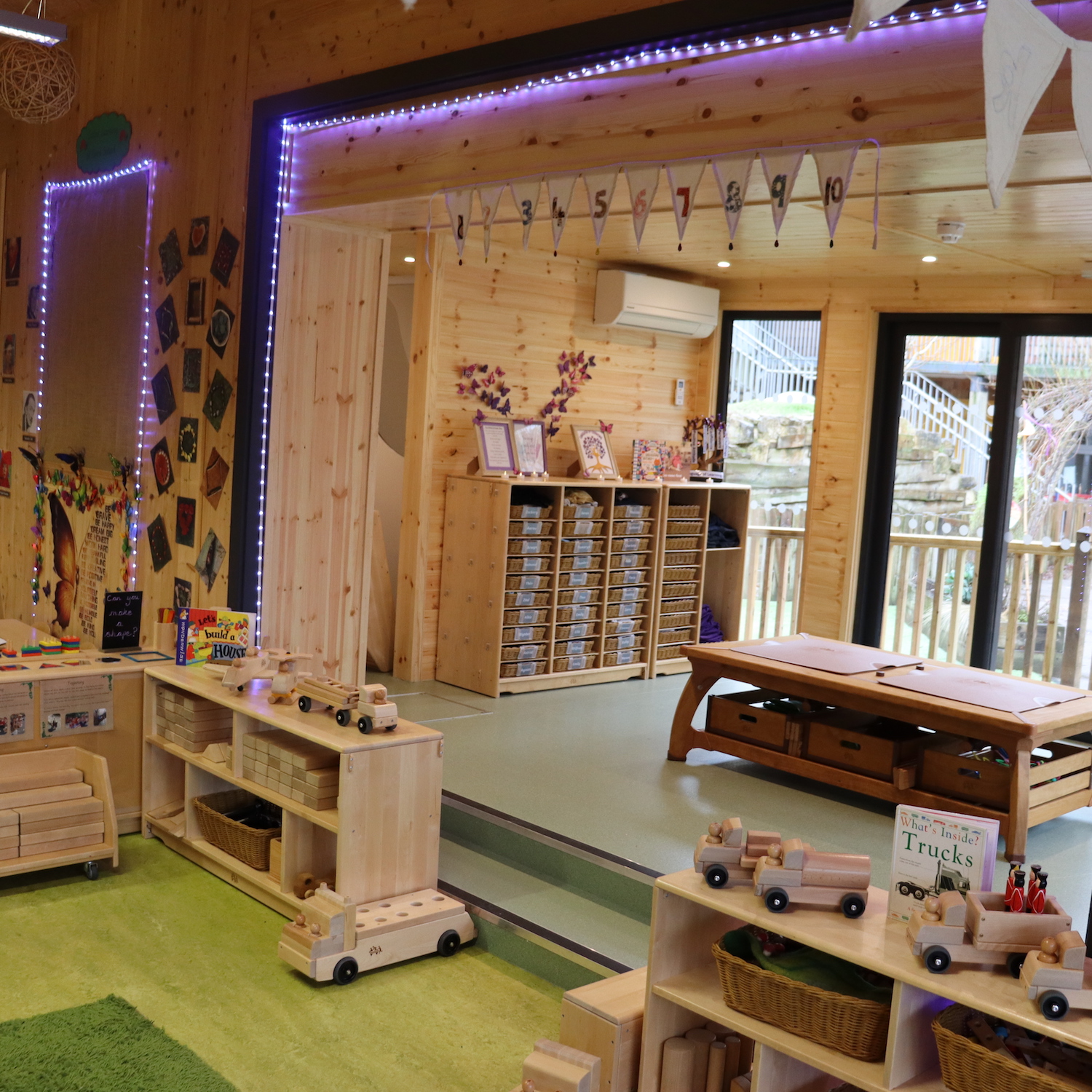 Hilden Grange nursery with wooden shelves filled with wooden toys and trucks and a green floor