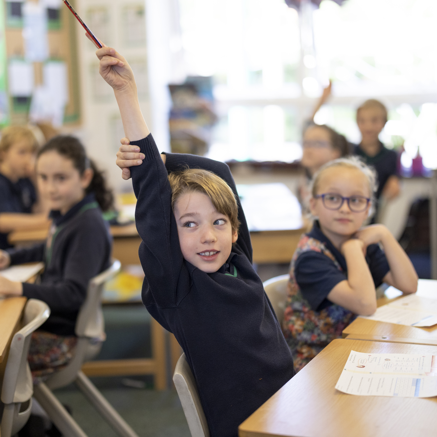 boy in navy jumper putting his hand up in class