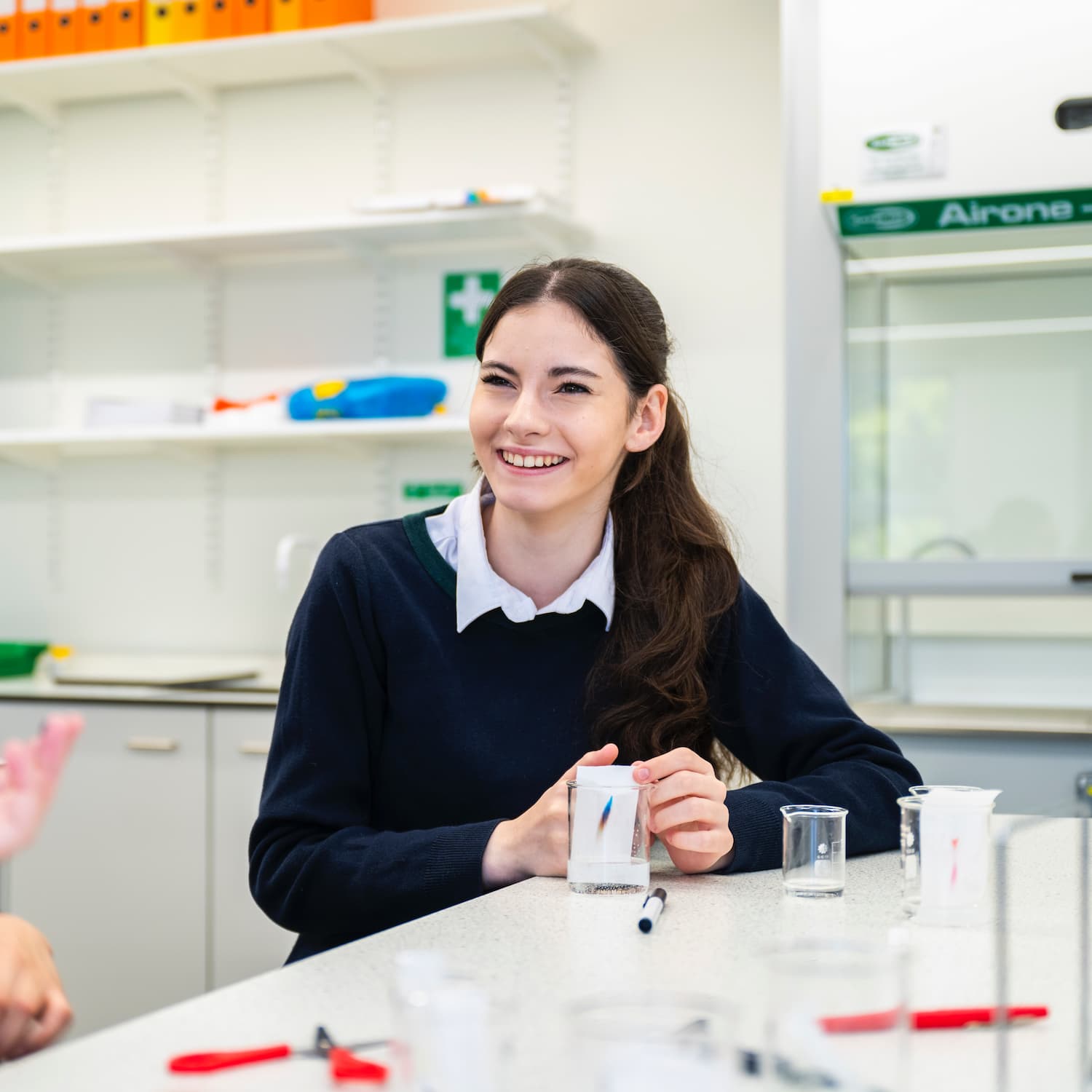 Girl in a navy jumper sitting in a science lab