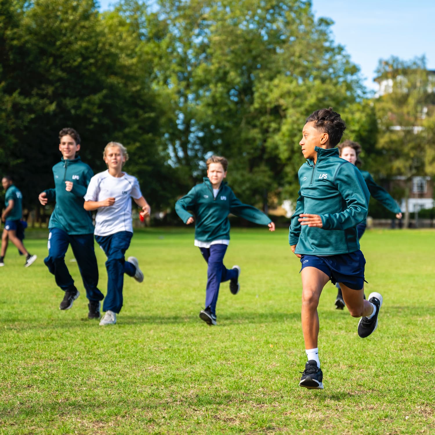 Pupils in green tops running on the green grass
