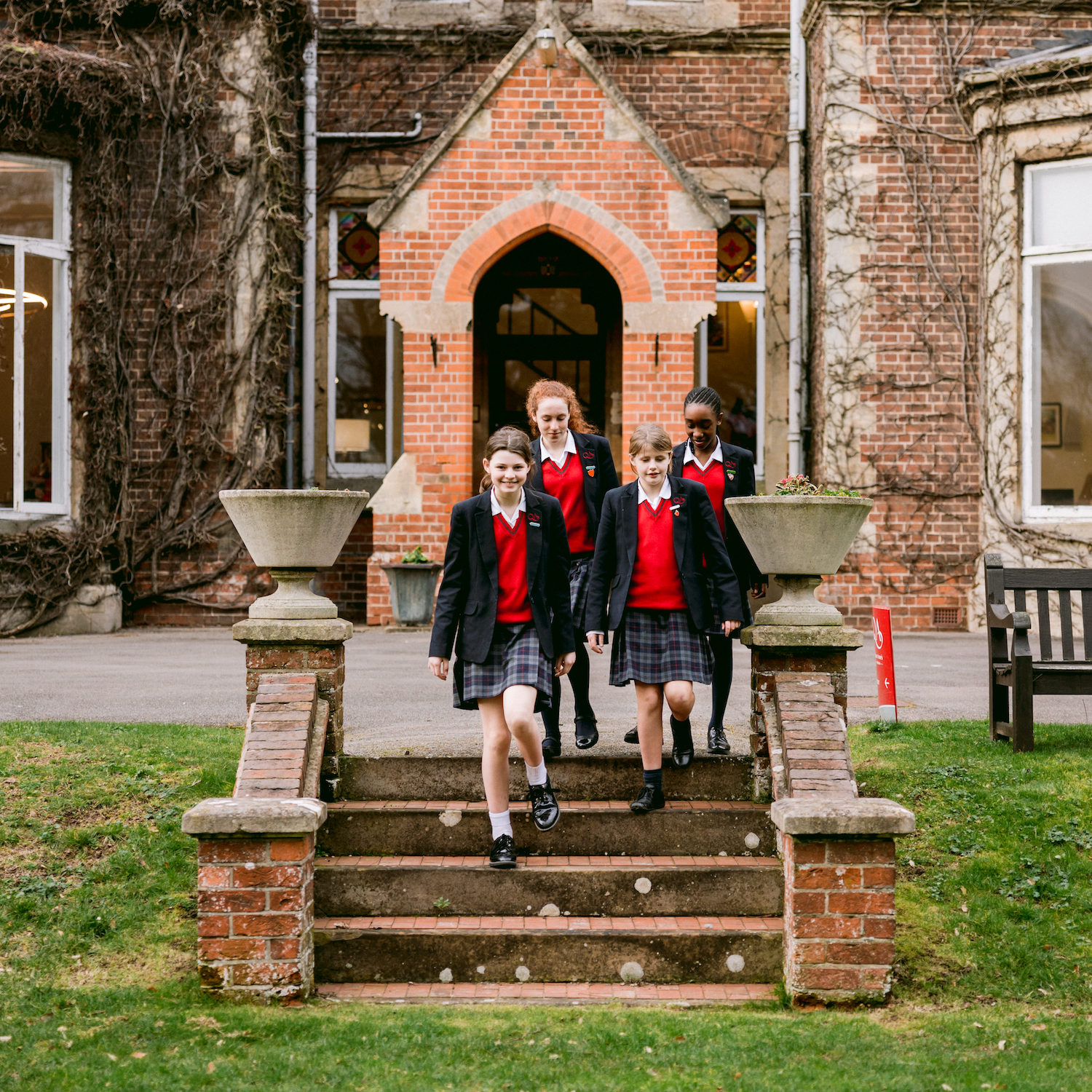 Girls in uniform walking down steps in from of Queen Anne's Caversham