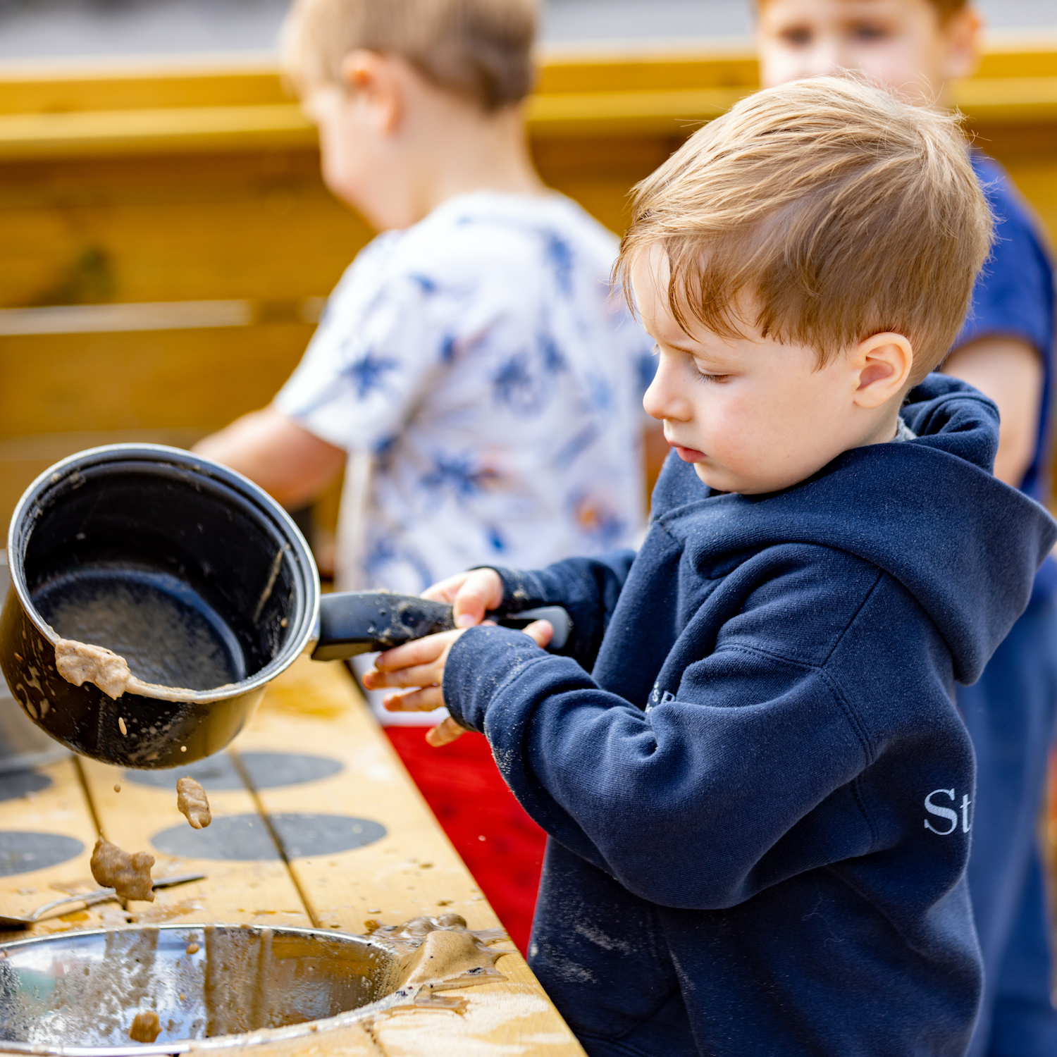 Little boy in blue hoody playing with a saucepan outside