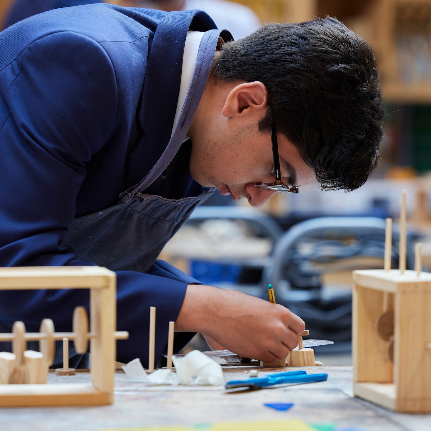 boy in glasses and a blue apron working with wood in DT