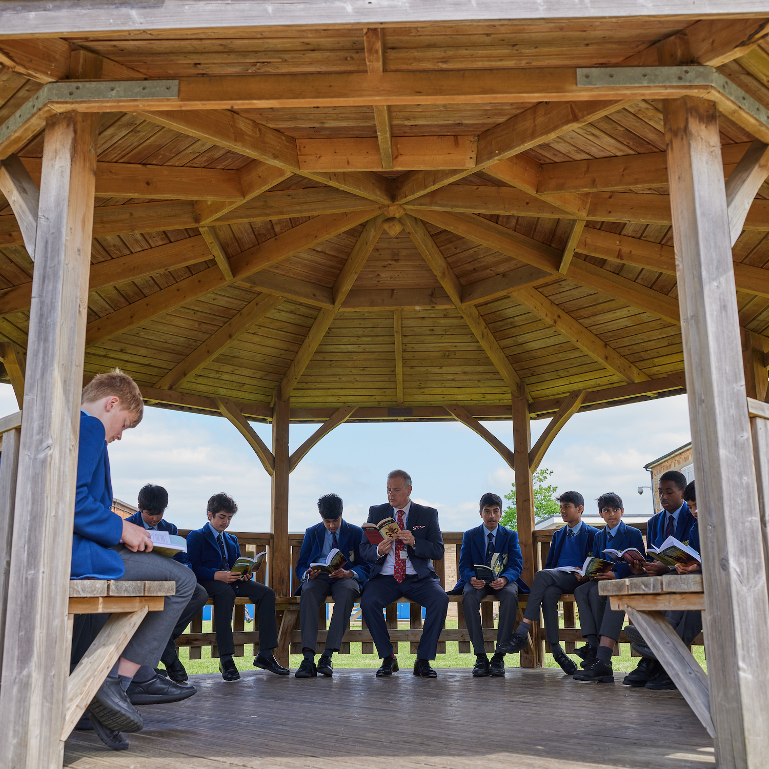 Boys reading in an outside classroom