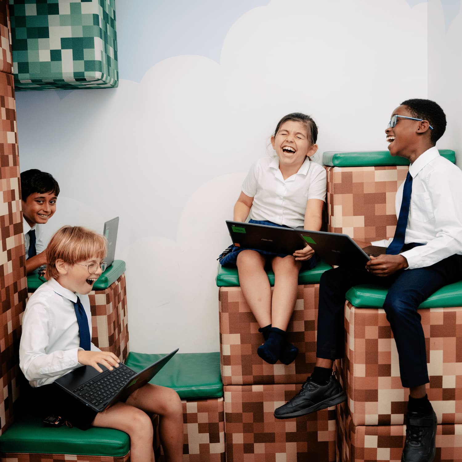 Children laughing with laptops