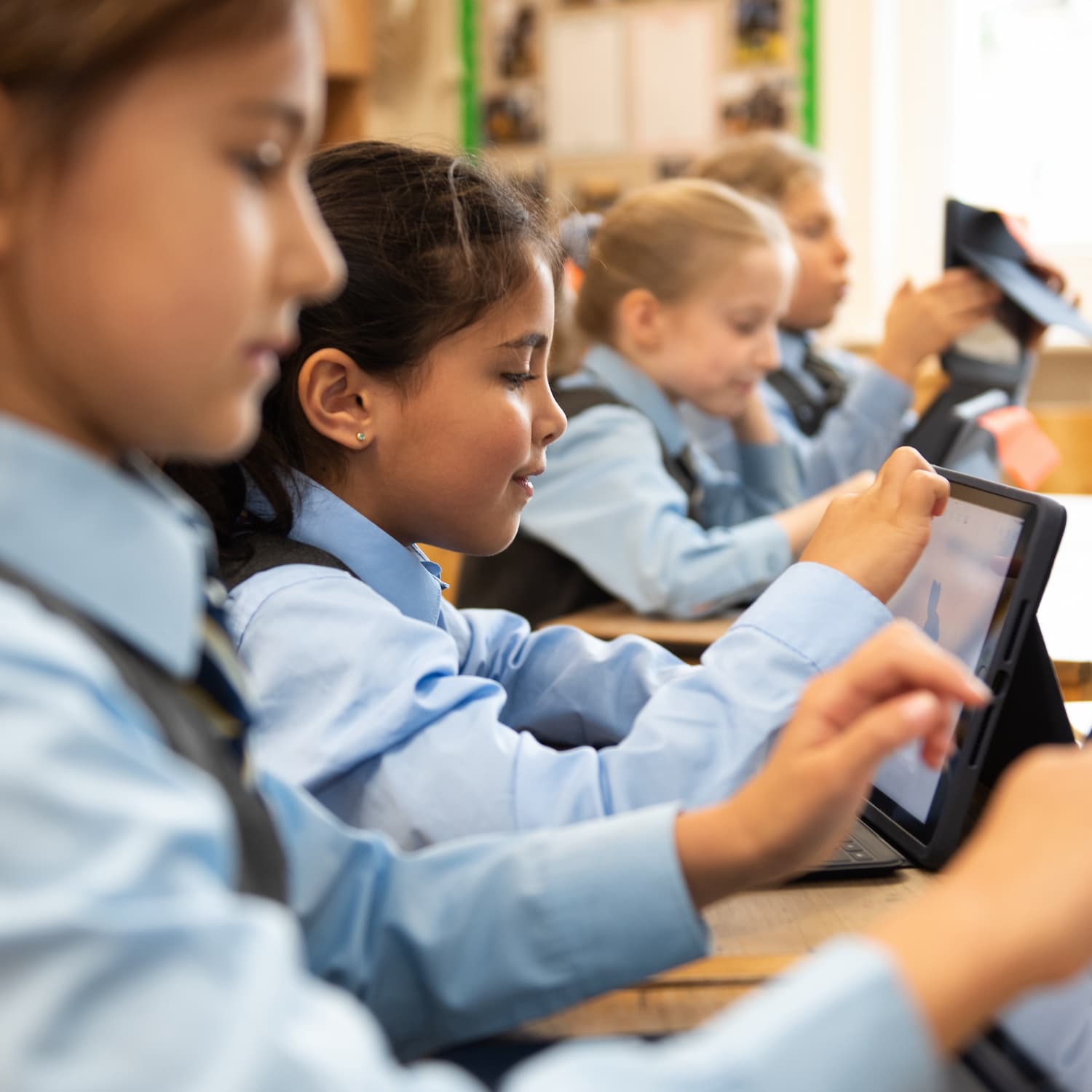 girls in blue shirts all on ipads in class