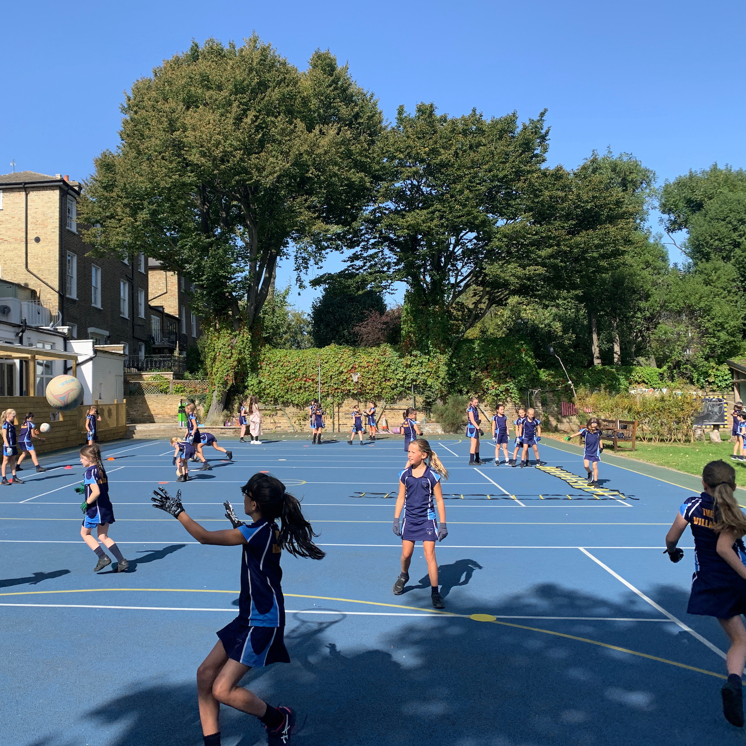 Girls playing netball on blue court with blue sky and green trees