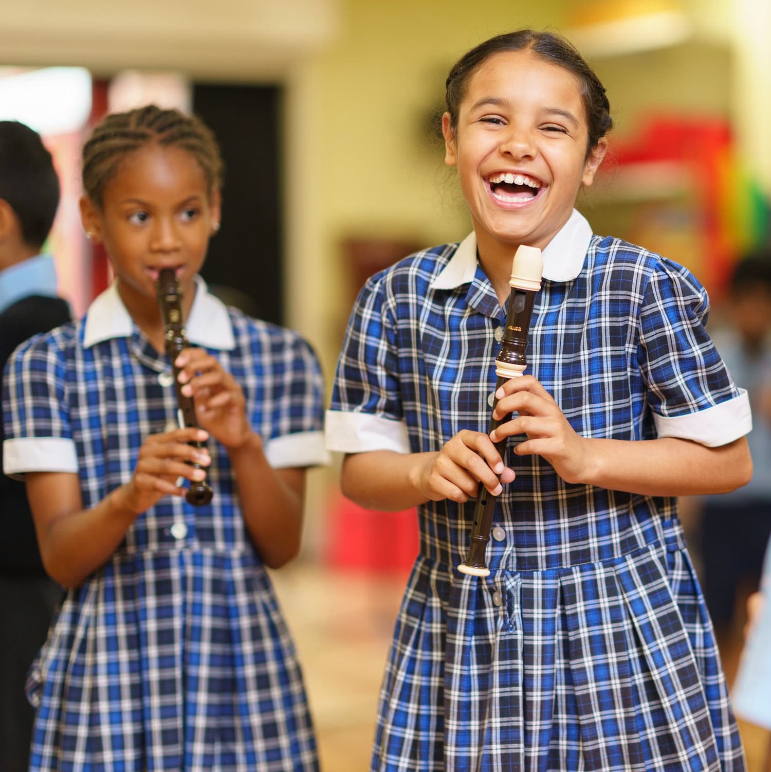 two girls in checked dresses playing the recorder