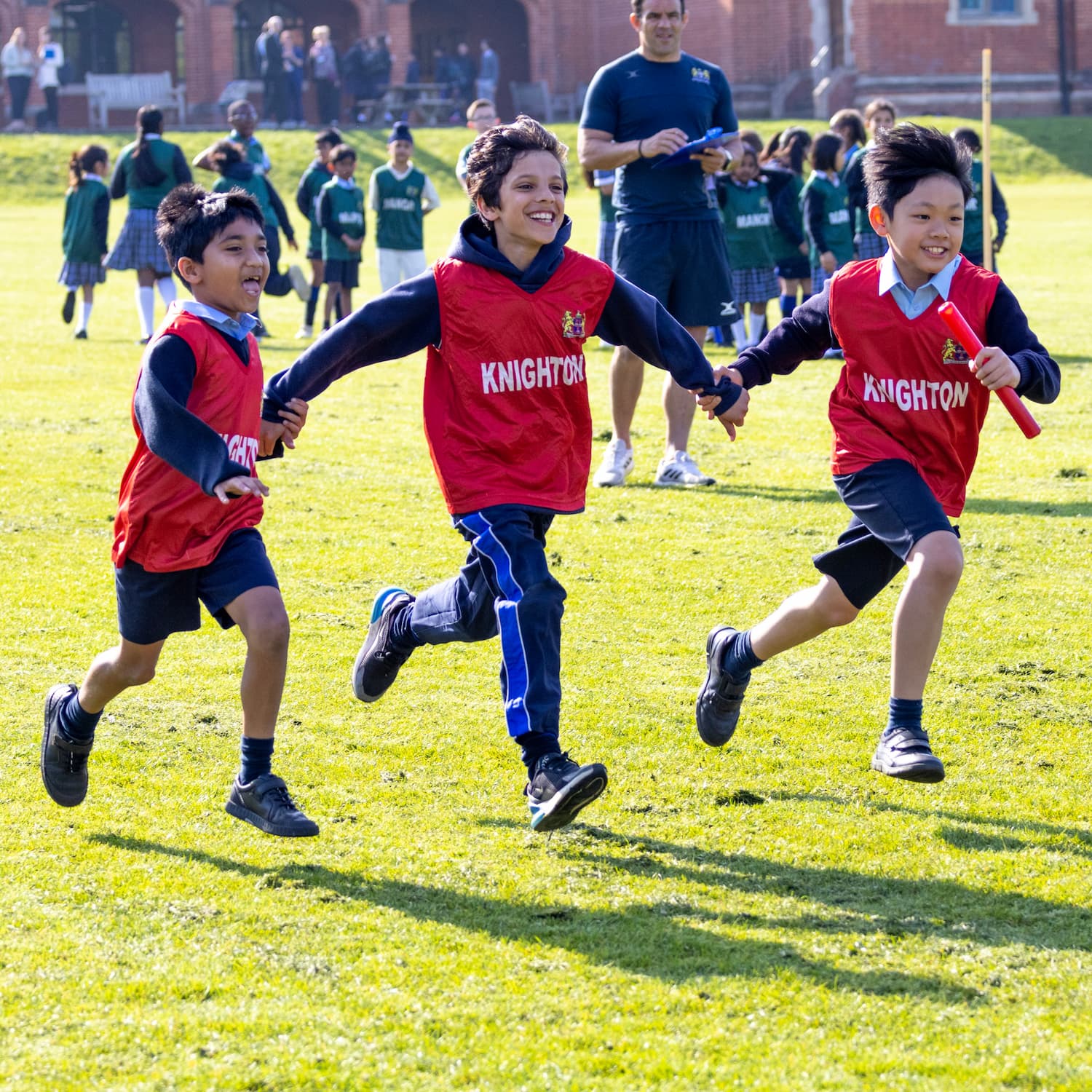 boys in red bibs running hand in hand