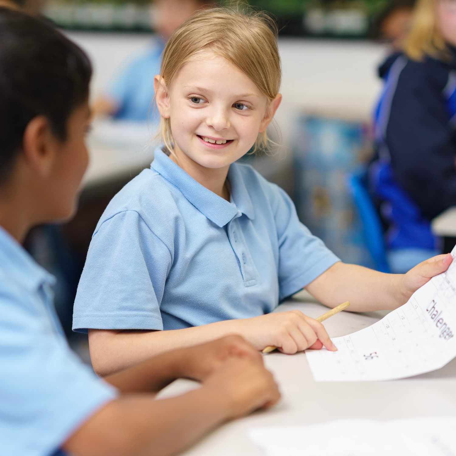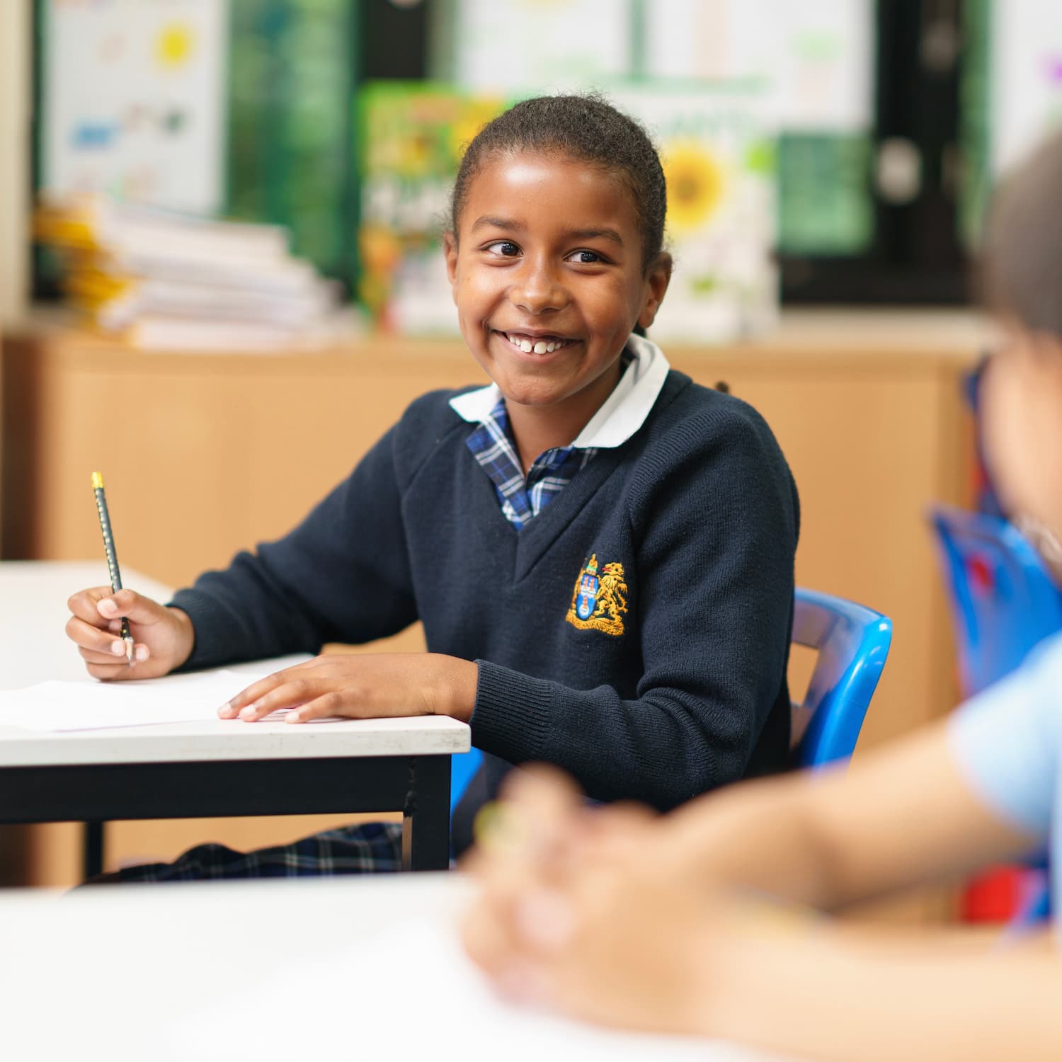 girl smiling in class holding a pencil