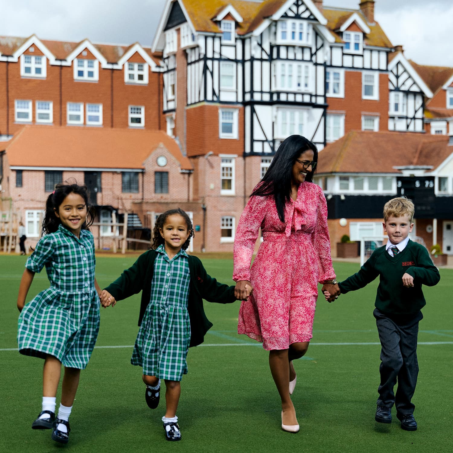 Bede's Prep holding hands with a teacher in a pink dress