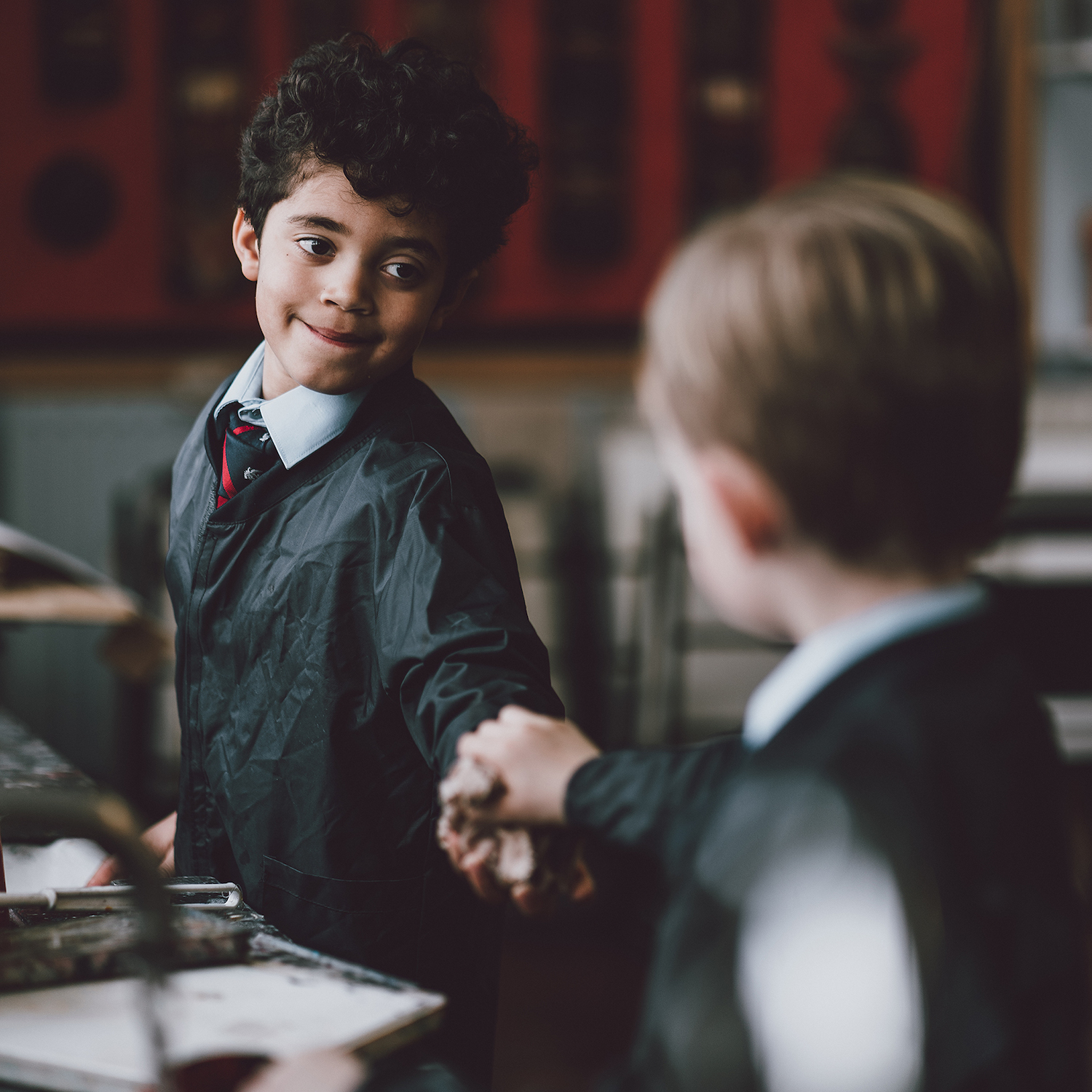 Boys wearing black smocks in an art class