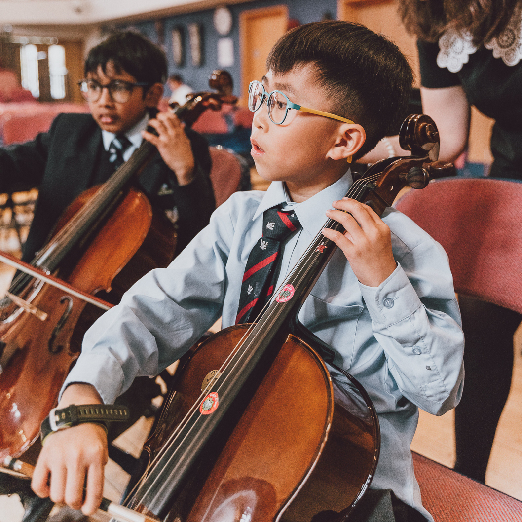 Boys wearing glasses and ties playing the cello