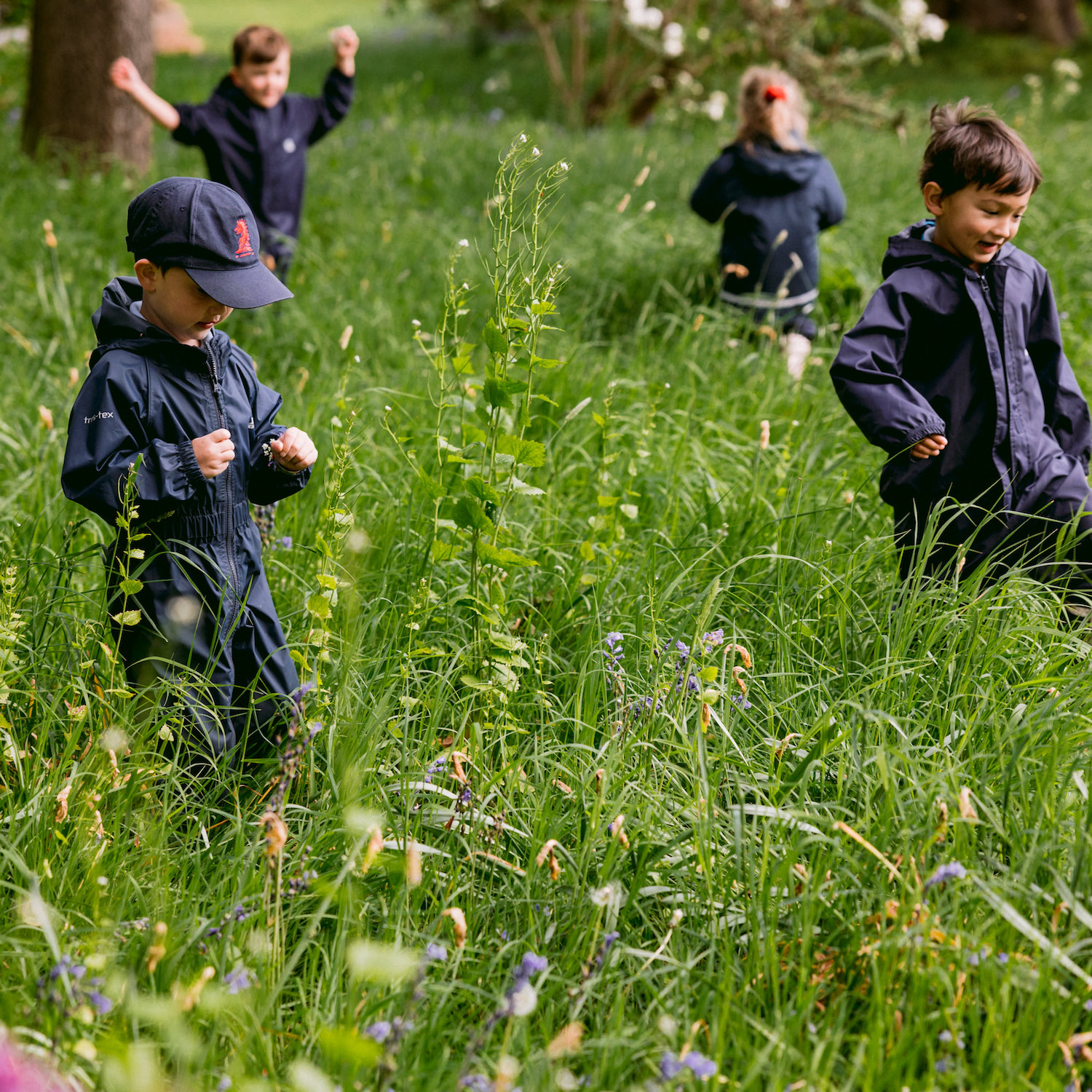 Boys in navy overalls walking through long grass with wild flowers