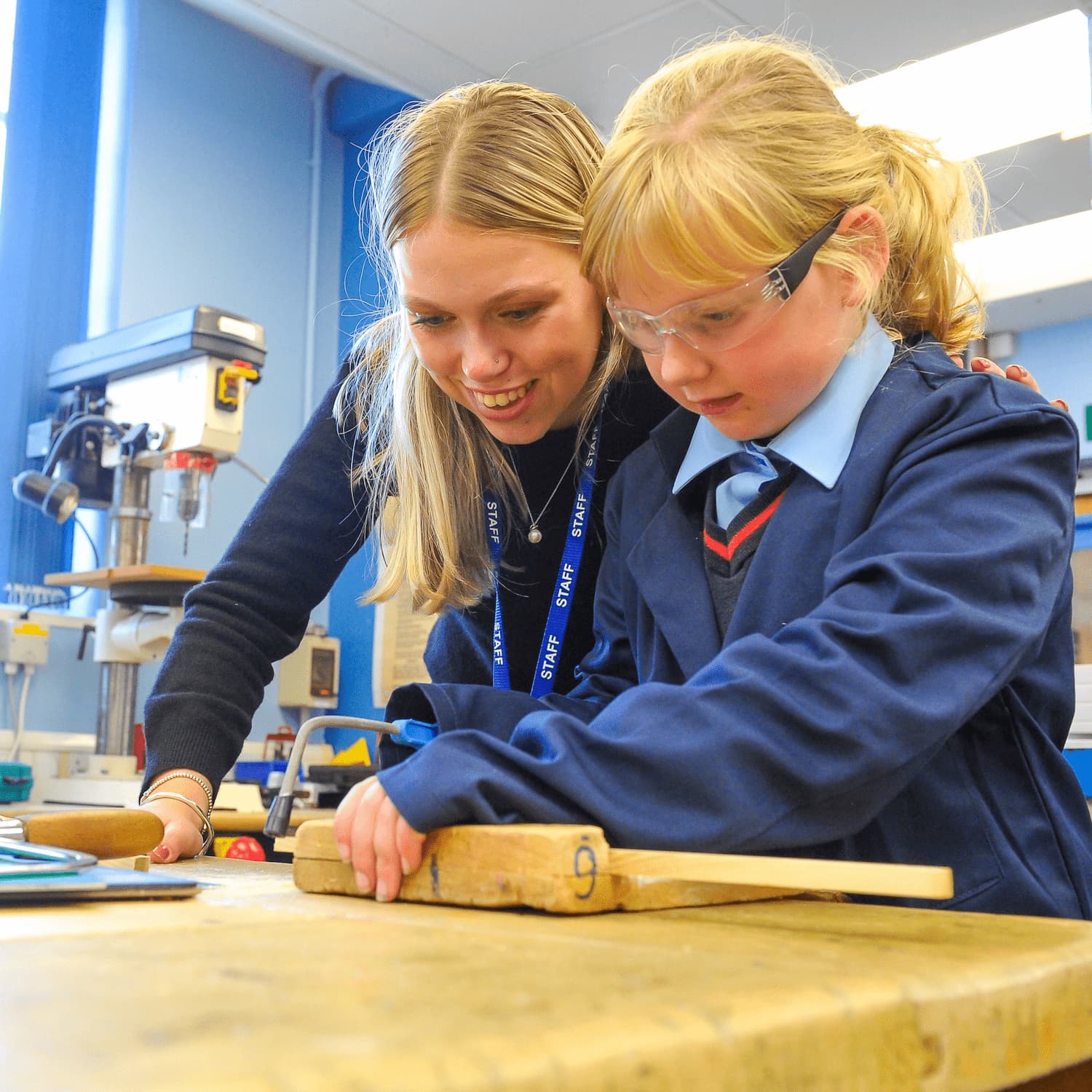 Girl being helped in a carpentry lesson