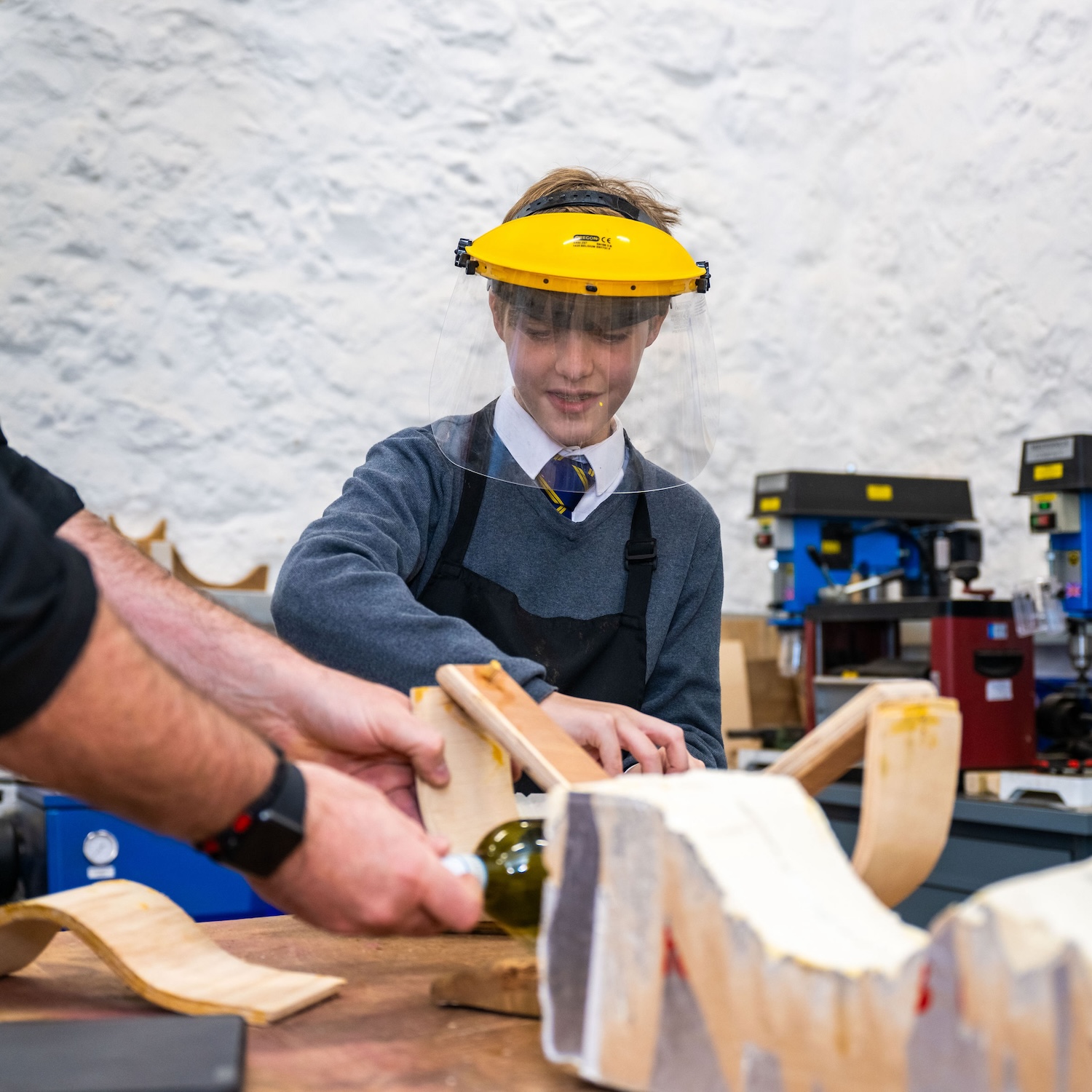 Boy a yellow helmet and safety visor cutting wood in DT