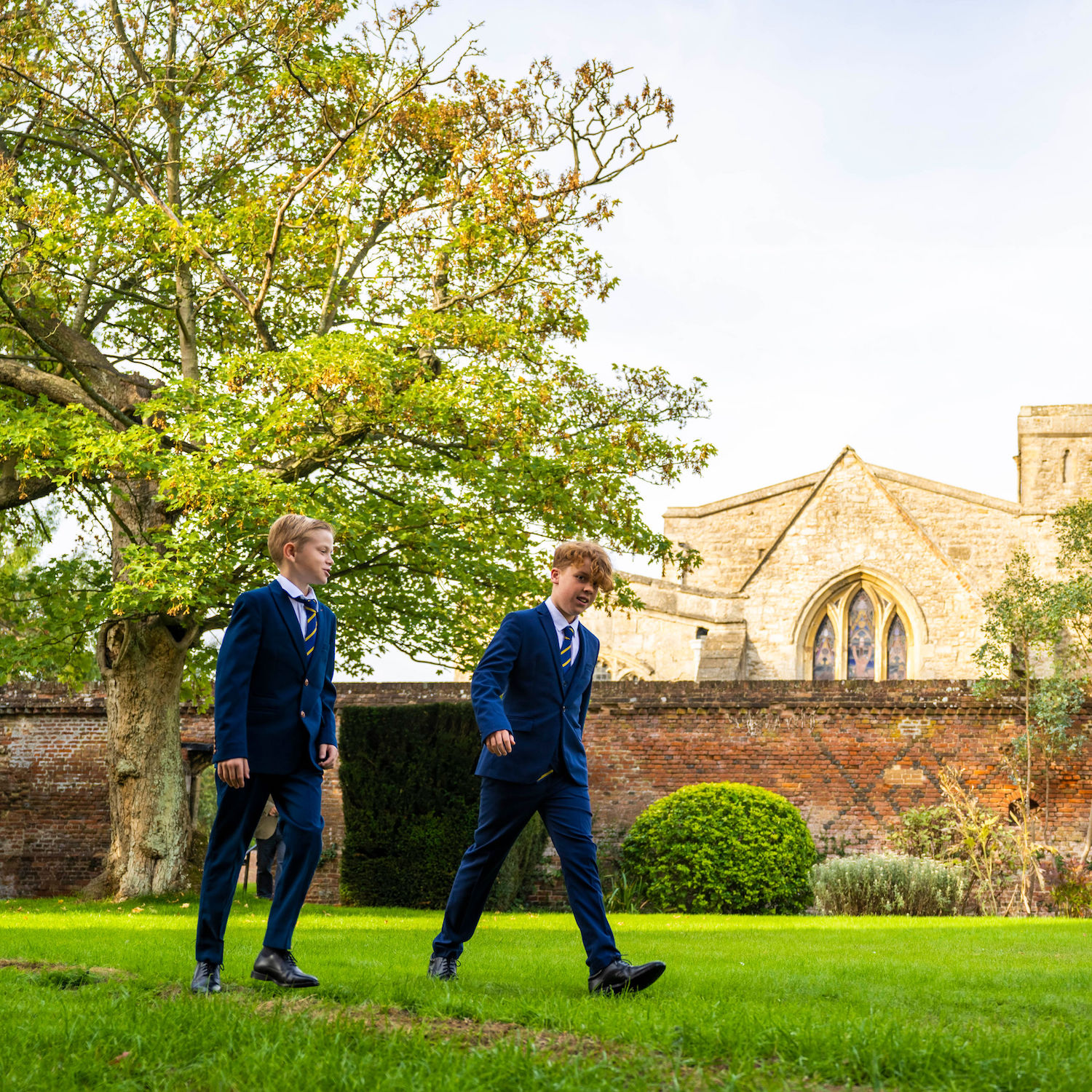 Boys in a blue blazers walking on the green grass by an old stone wall