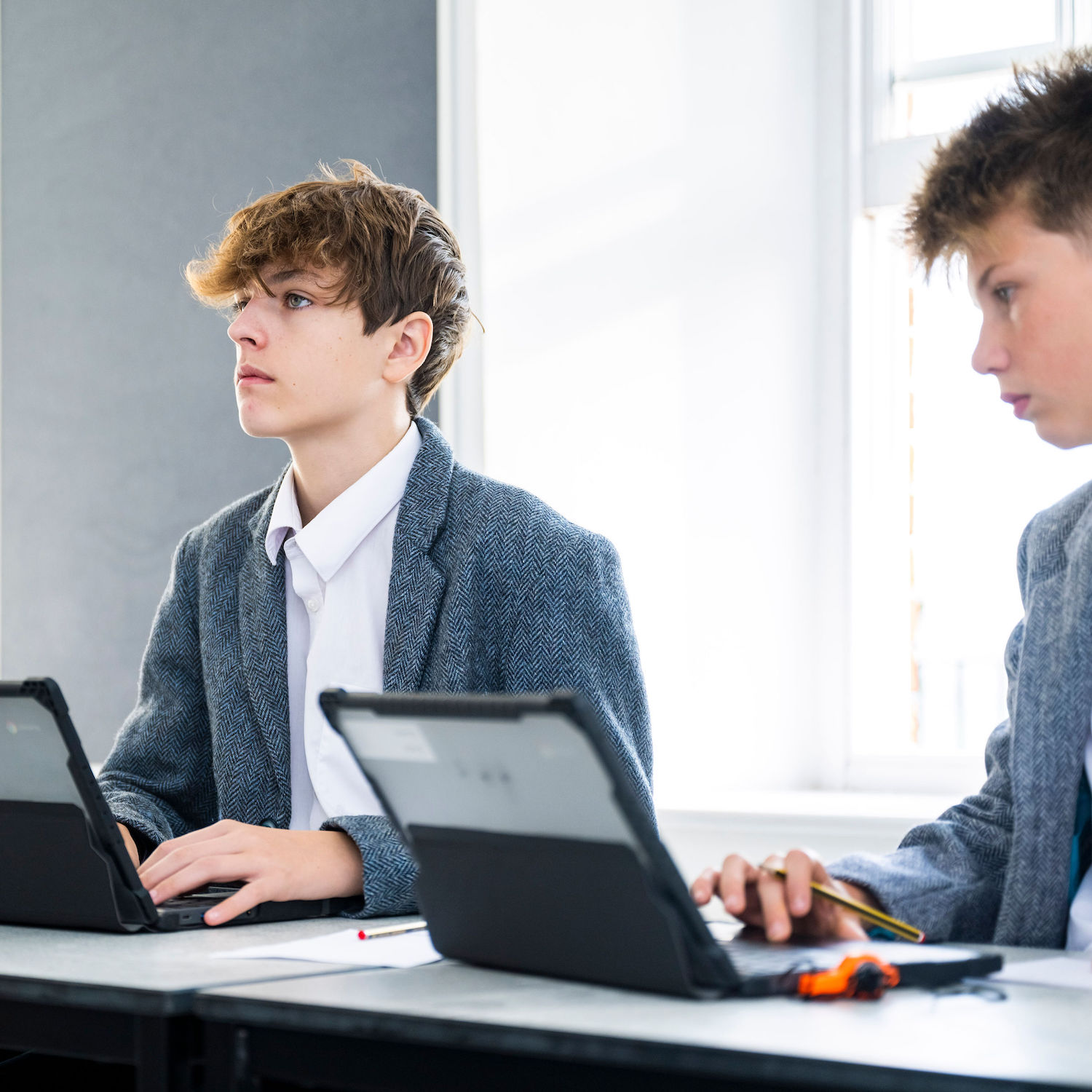 Boys in a grey tweed blazers working in class on laptops