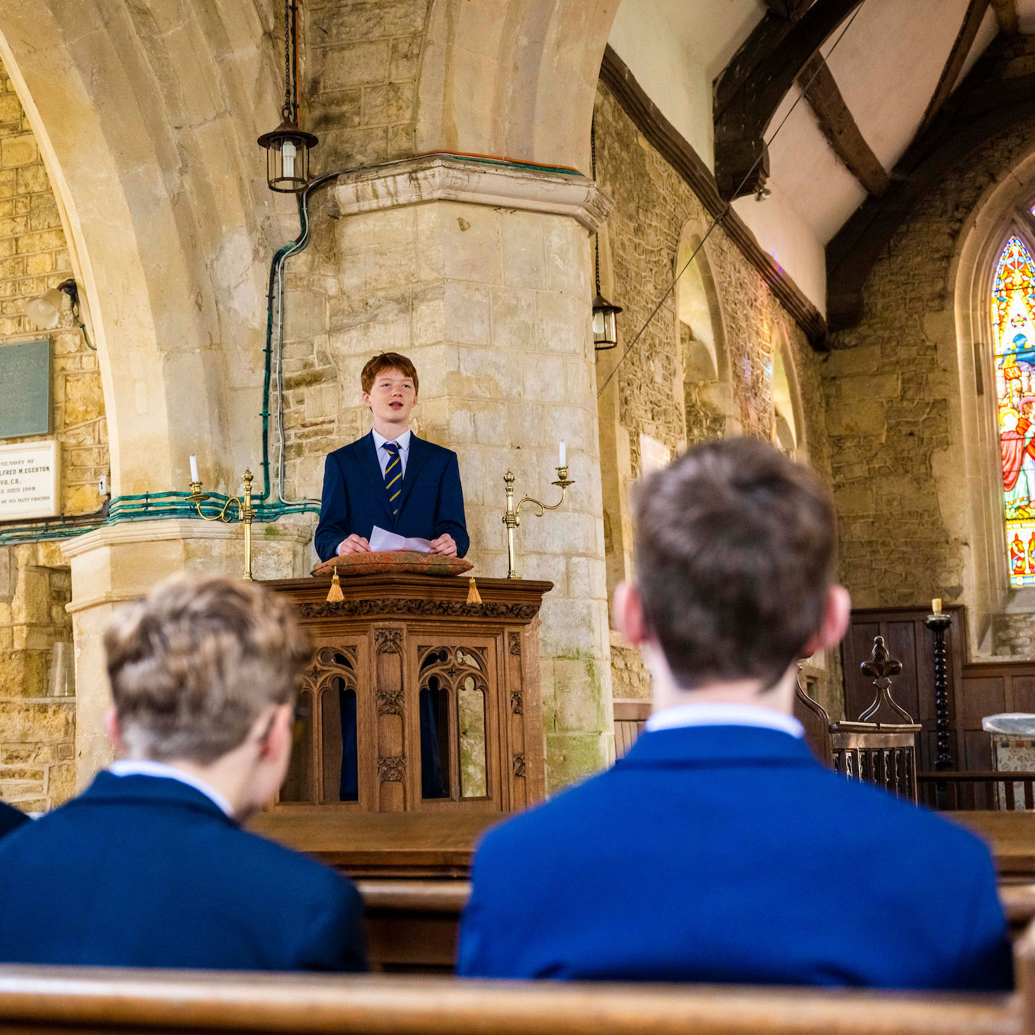 Boy in a blue blazer and tie standing reading in chapel