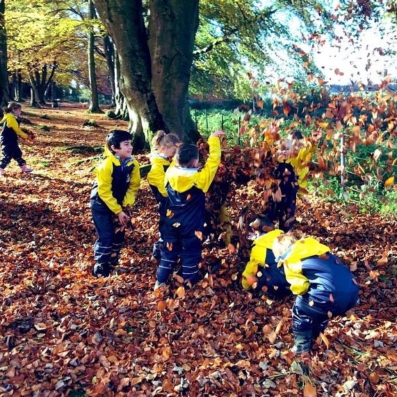children in blue and yellow overalls playing in the leaves