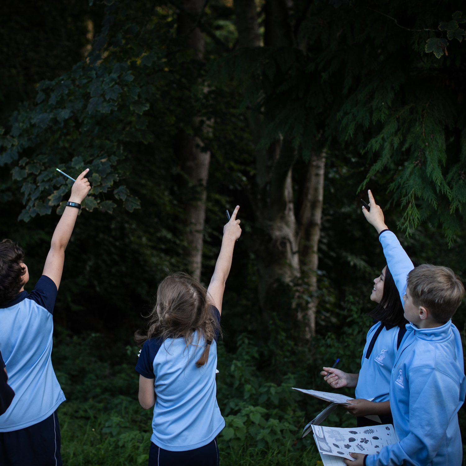 Students in pale blue tops pointing at trees in outdoor learning class