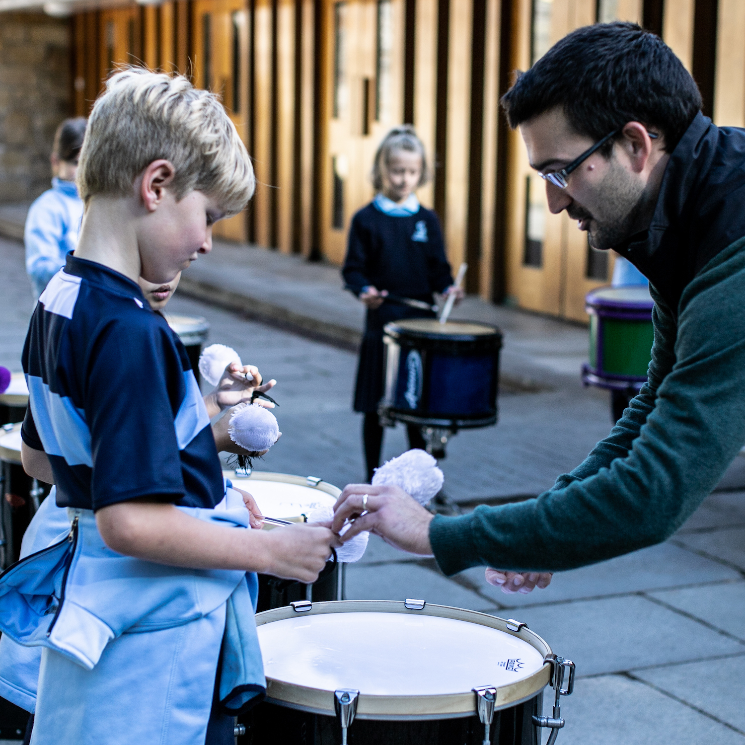 Music teacher helping boy in blue top play the drums