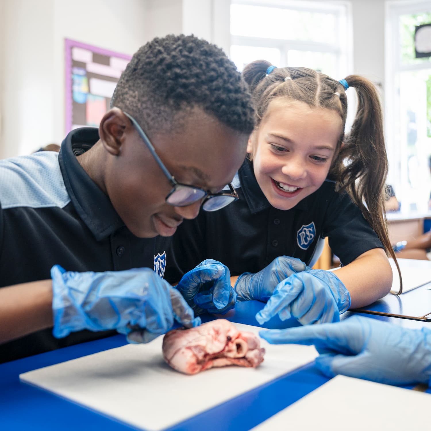Pupils in a biology glass wearing blue gloves