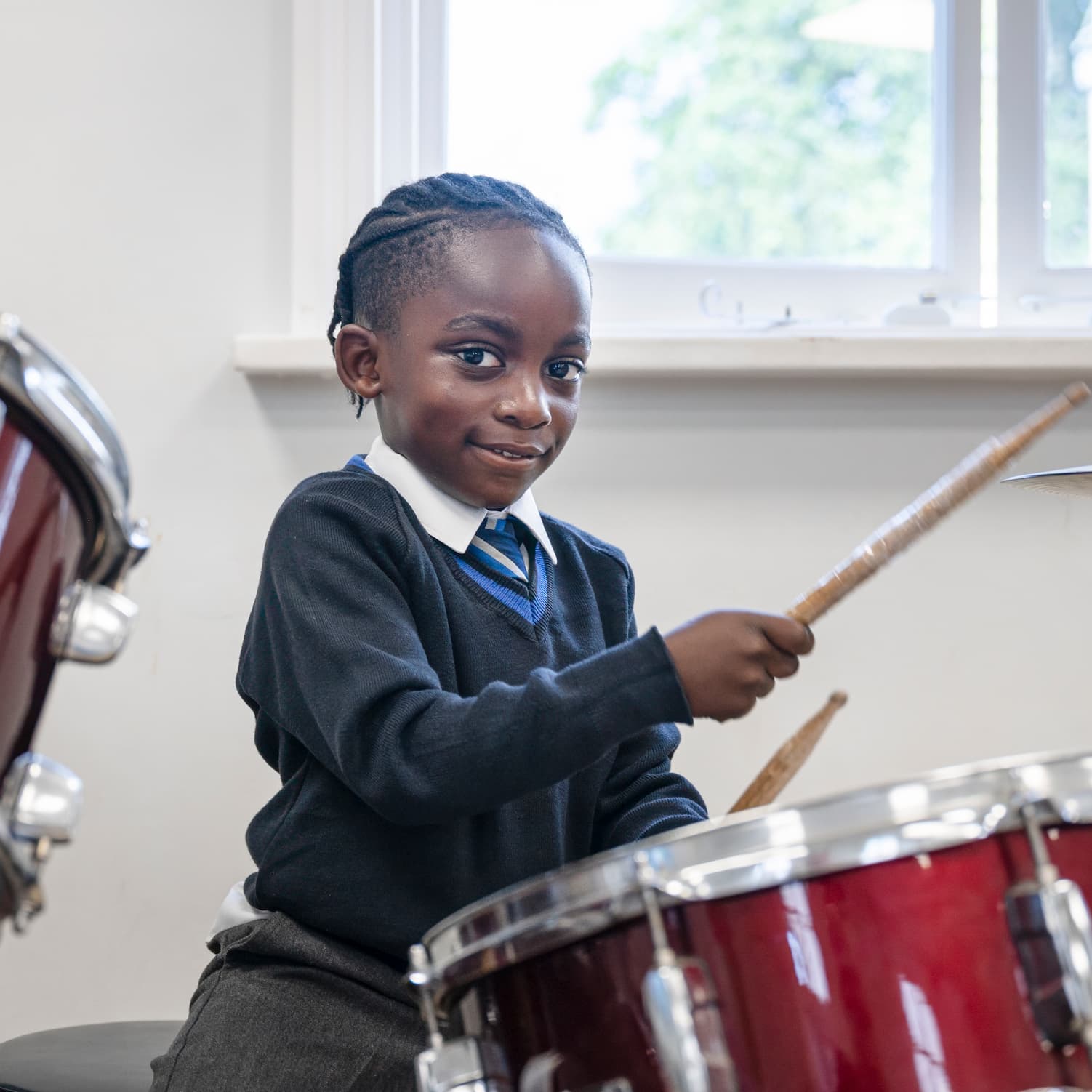 Boy in a navy jumper playing the drums
