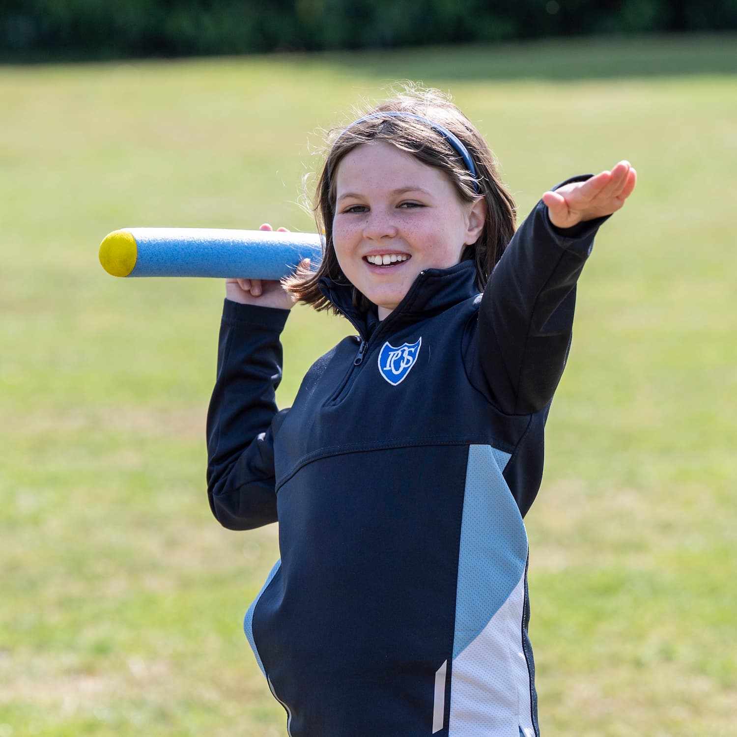 Girl in navy tracksuit throwing a foam arrow