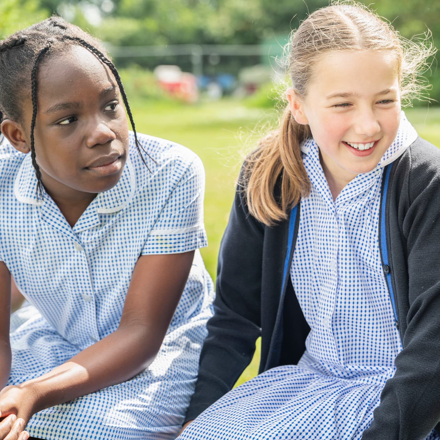 Two girls in blue and white dresses sitting together
