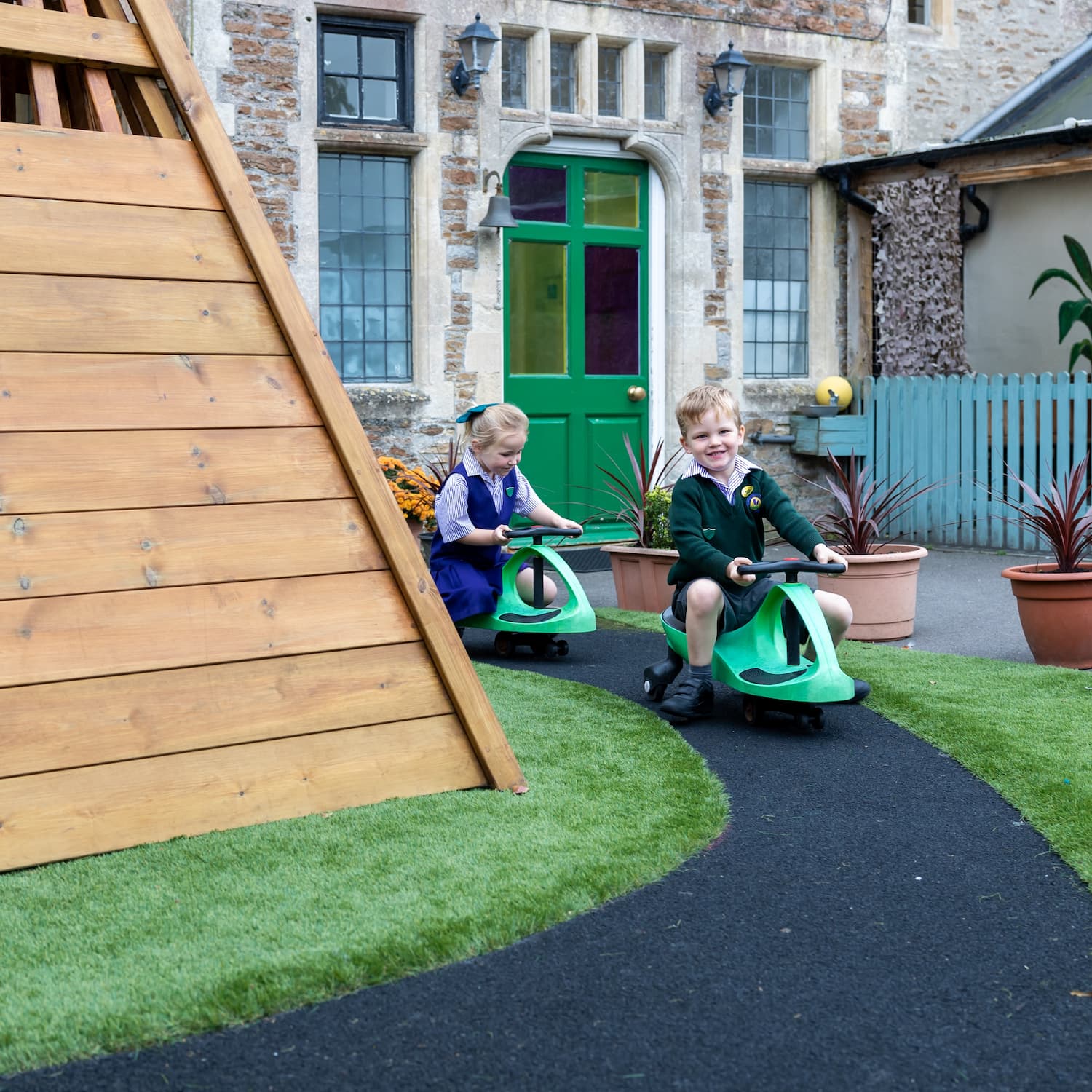 Two children on green scooters