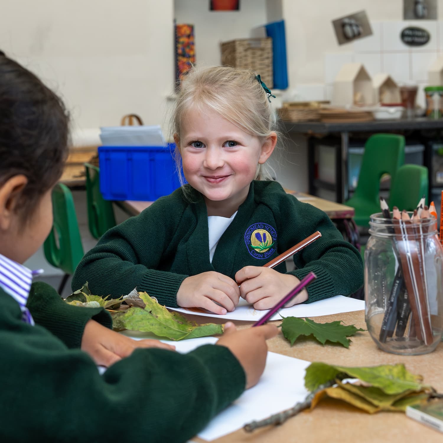 Little girl drawing leaves in class