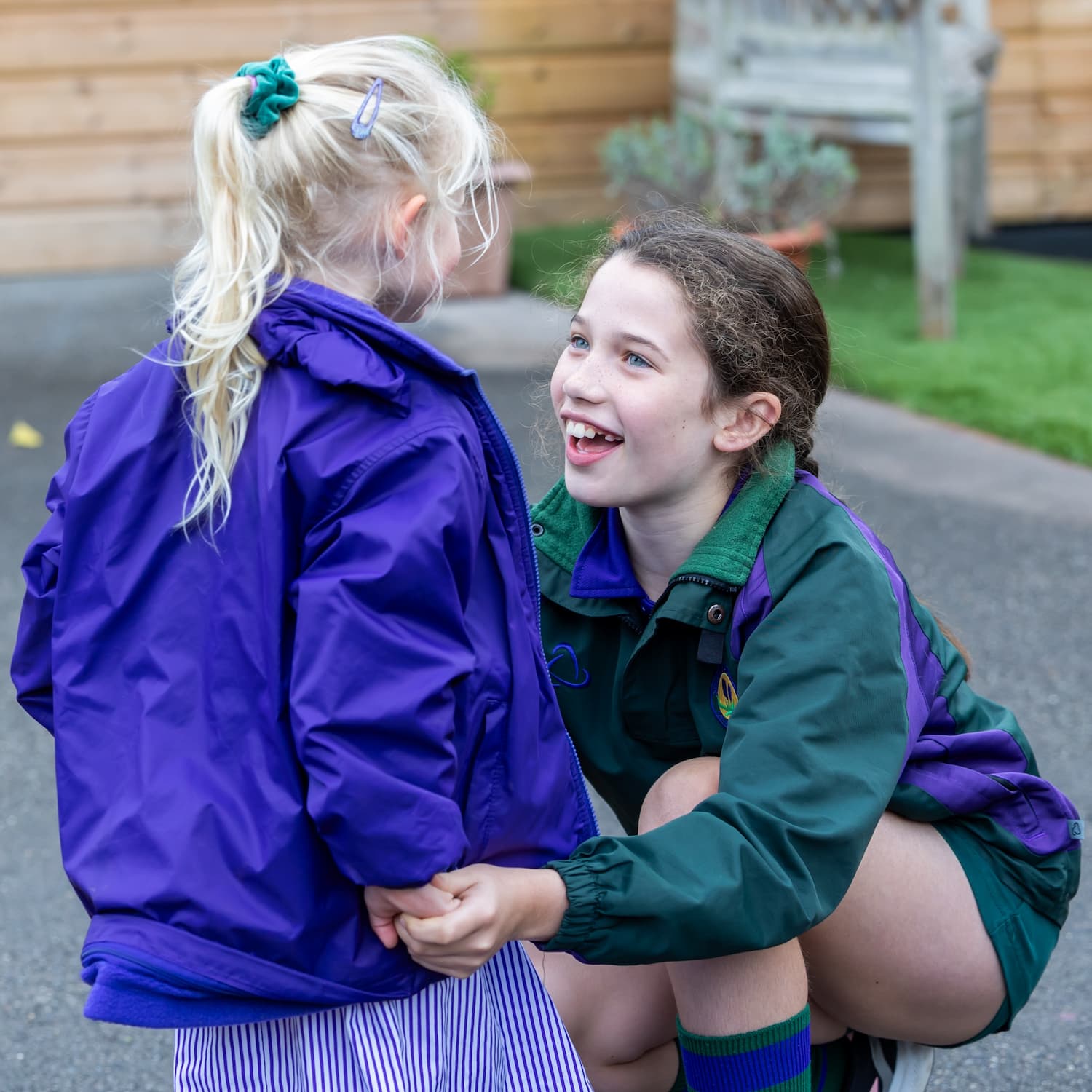 older girl talking to a younger girl in the playground