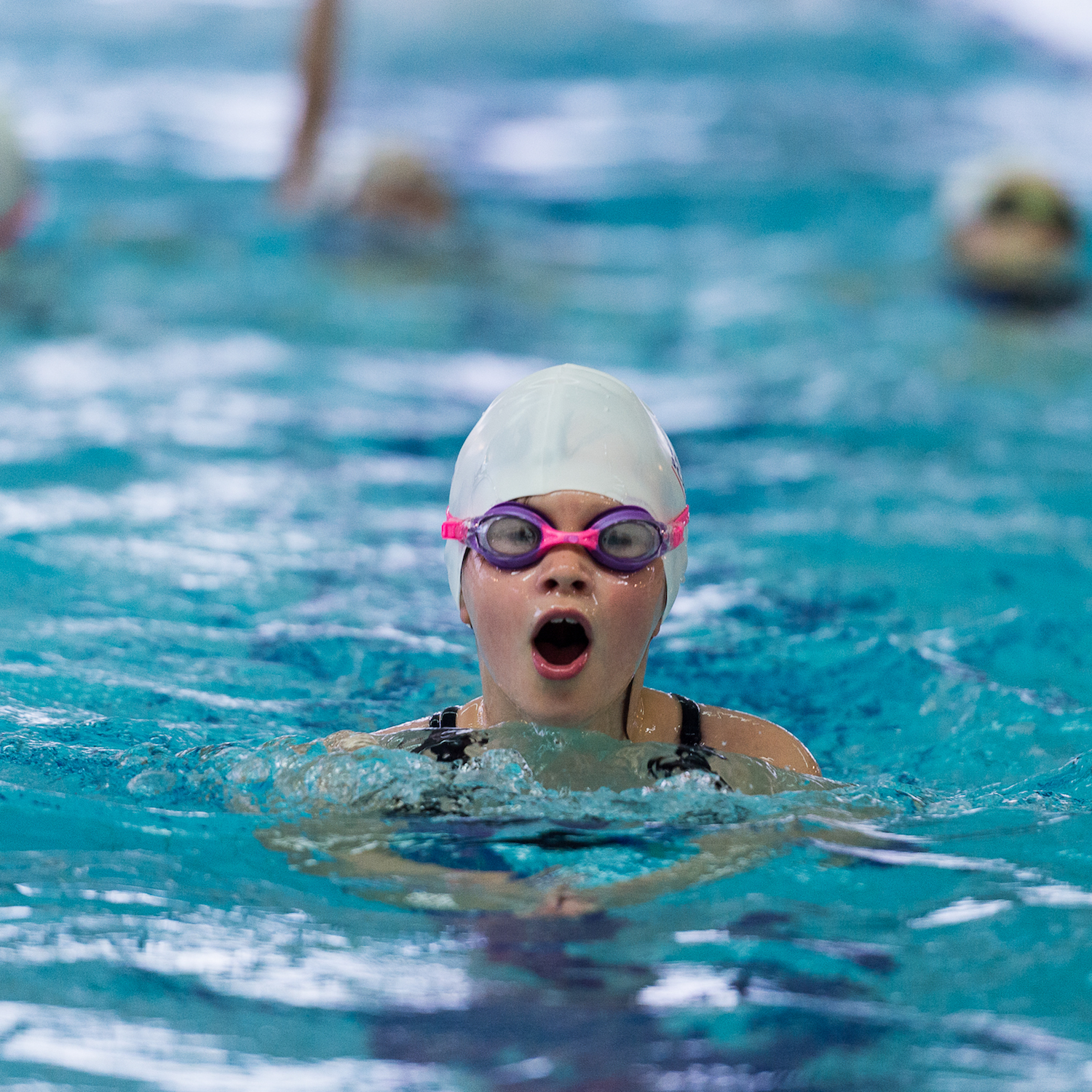 Girl in swimming pool wearing a white cap and purple and pink goggles