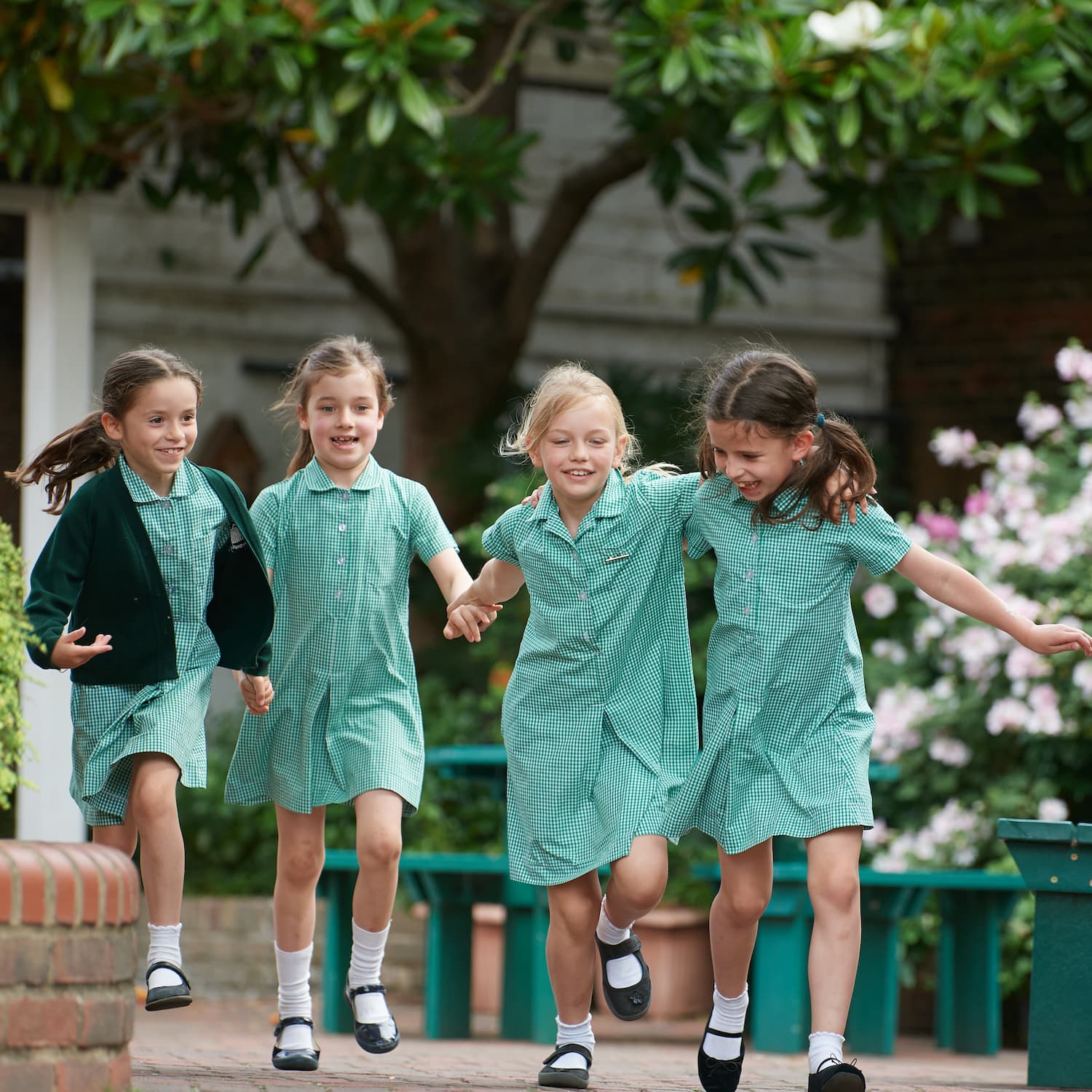 girls in green and white dresses running arm in arm