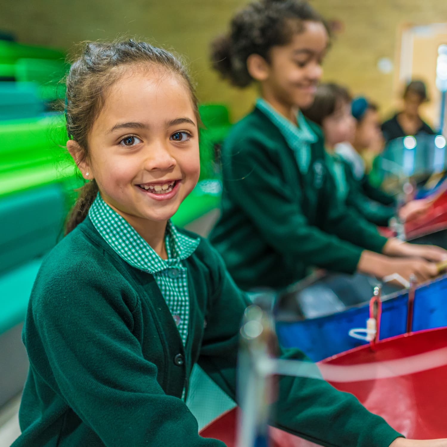 girl in a green cardigan playing the drums