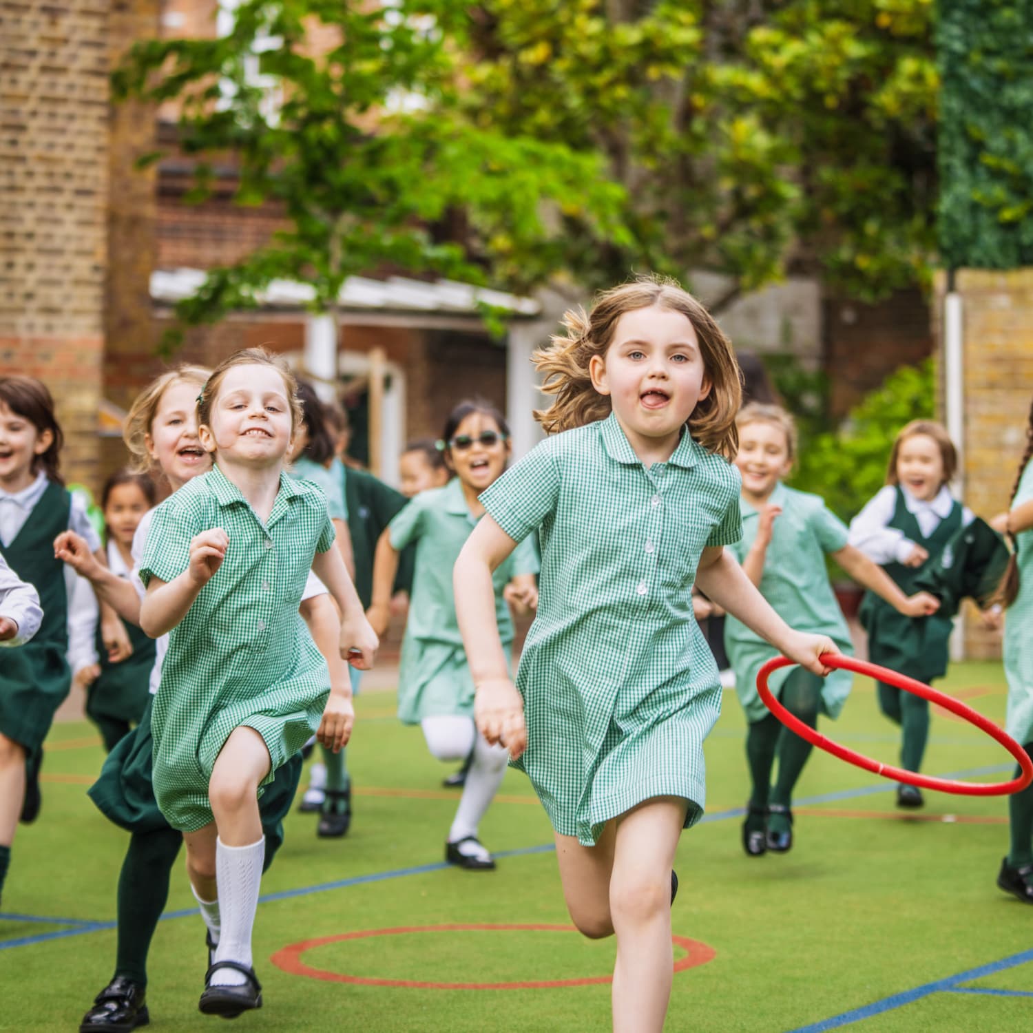 girls in green and white dresses running