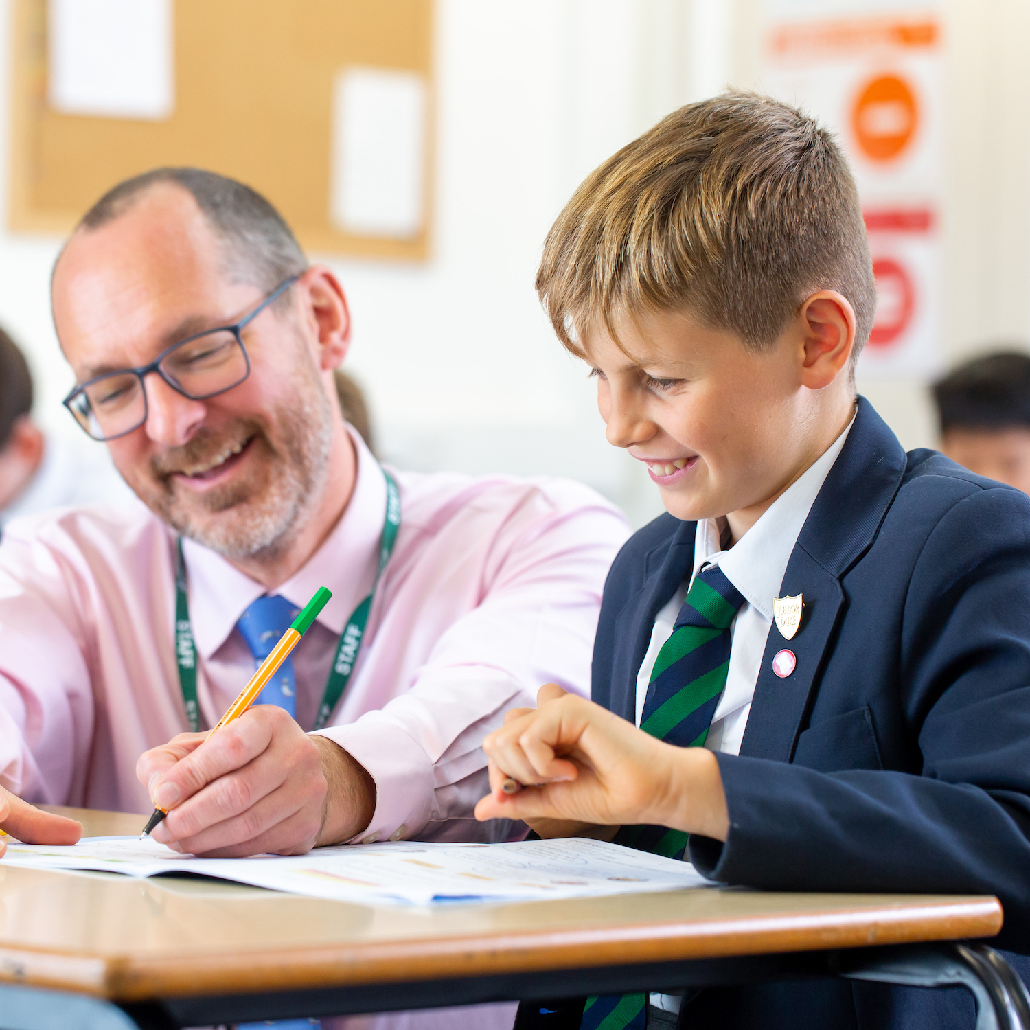 Boy in a green and blue striped tie in a maths class with a teacher