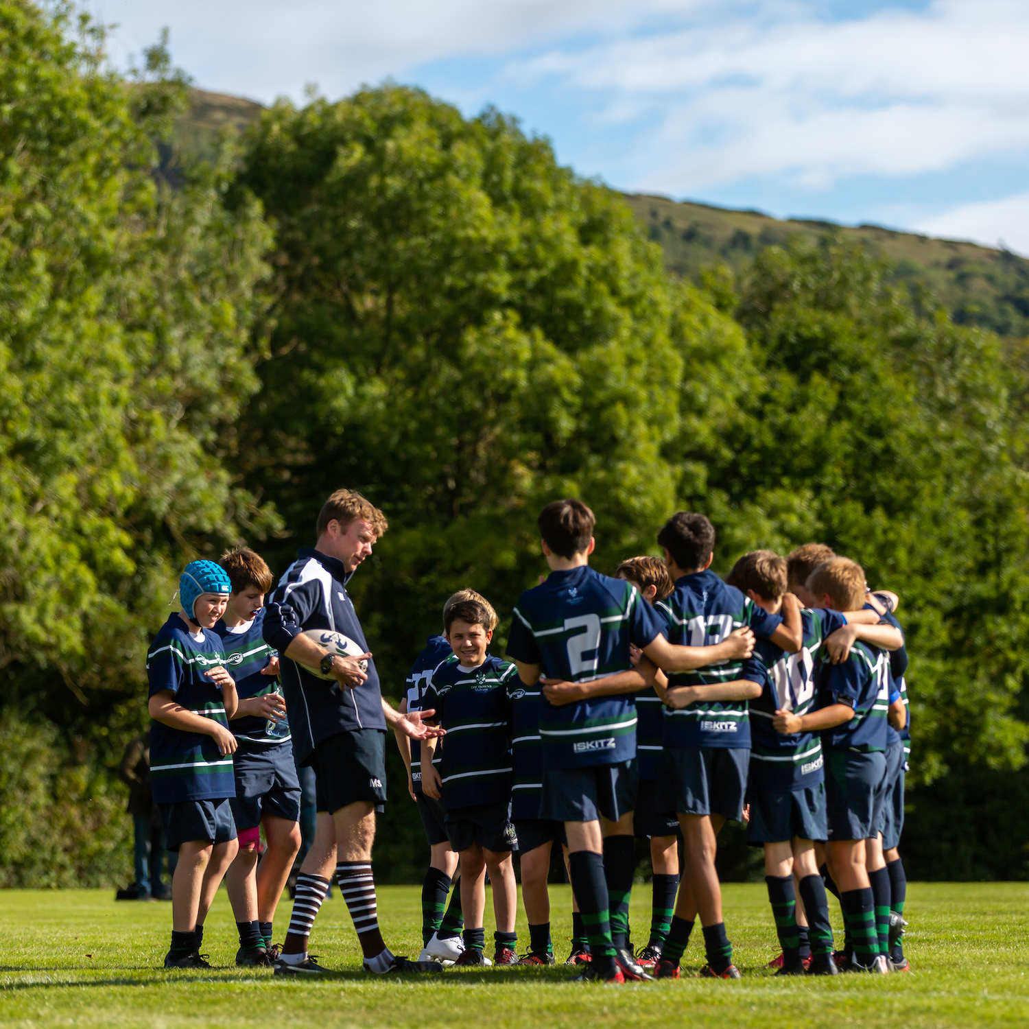 Boys rugby team gathered together with green trees in the background