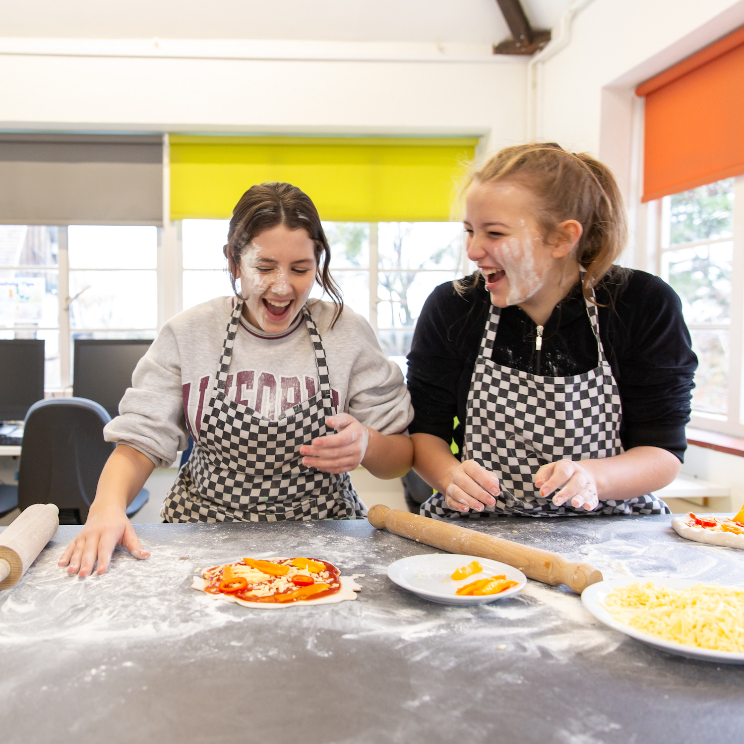 Girls in black and white checked apron making pizzas