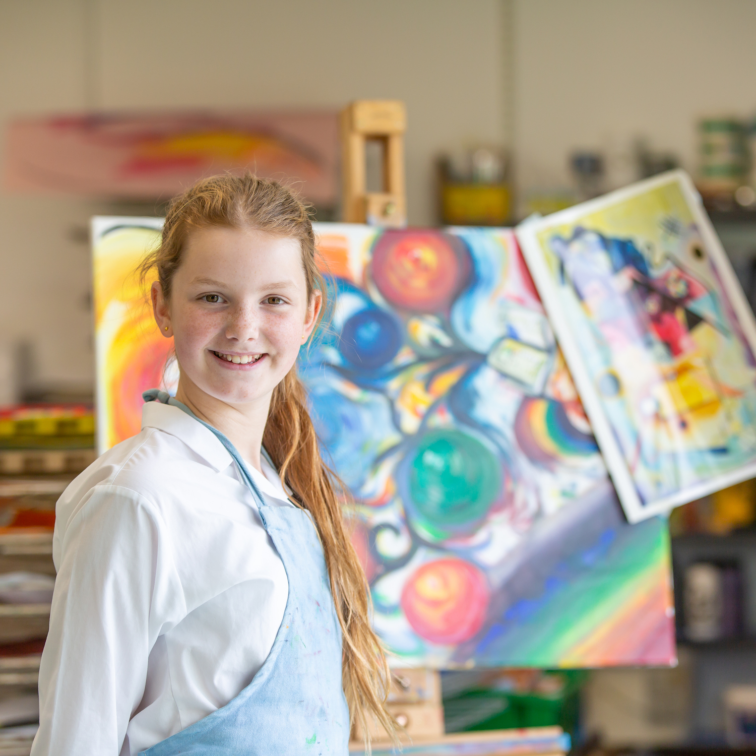 Girl in a blue apron standing in front of a painting
