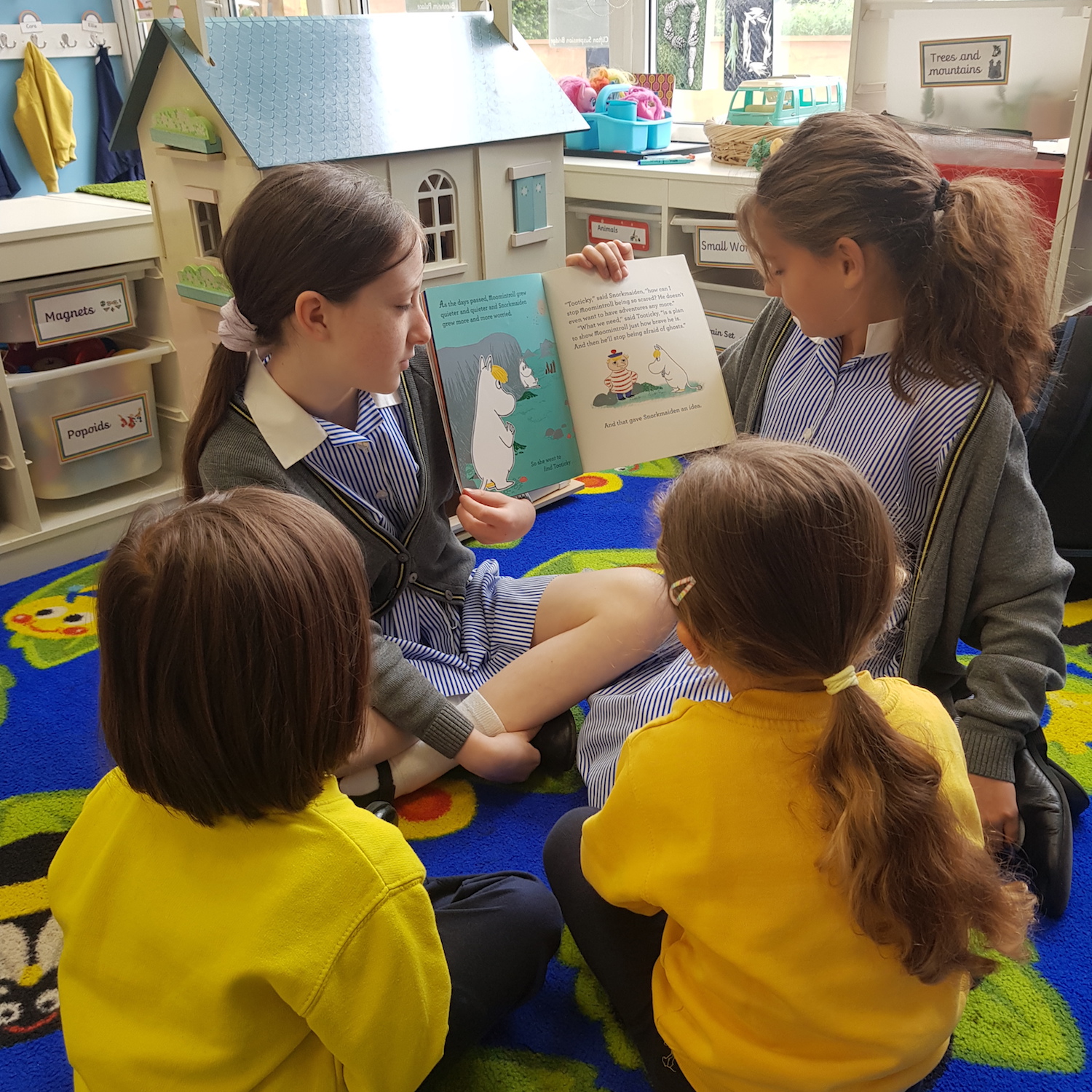 Older girls sitting on the floor reading to younger girls in yellow tops