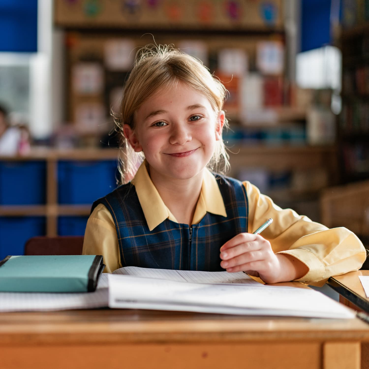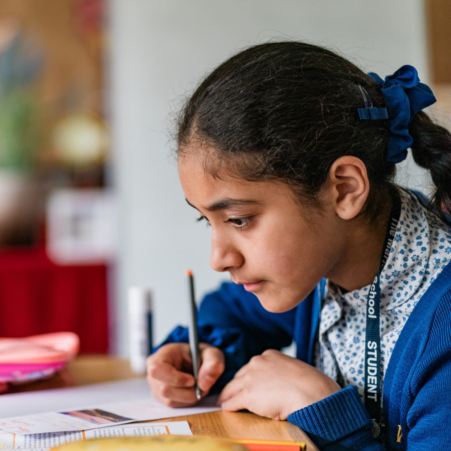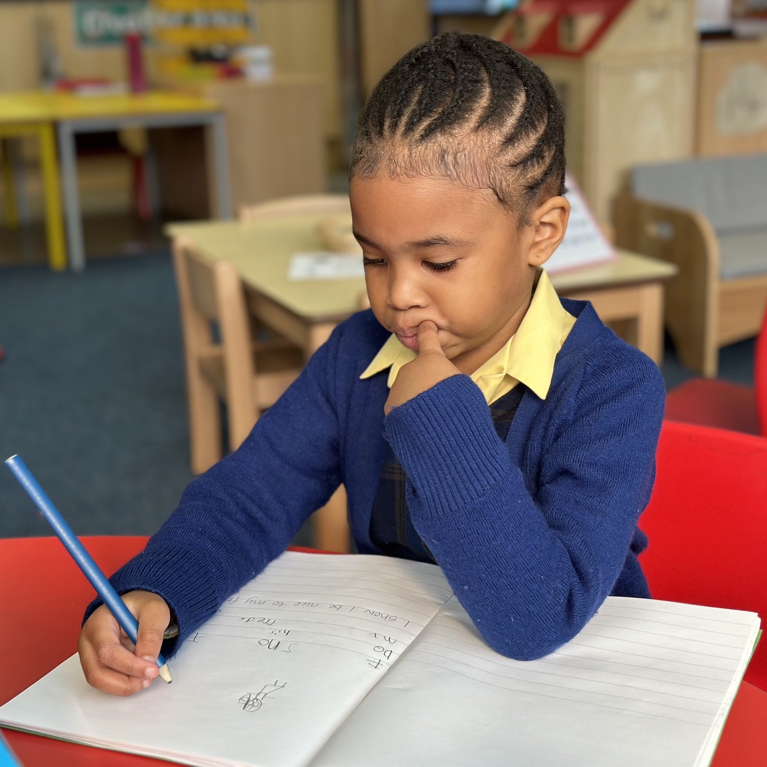 Little girl in a blue cardigan and yellow shirt sitting at a red desk