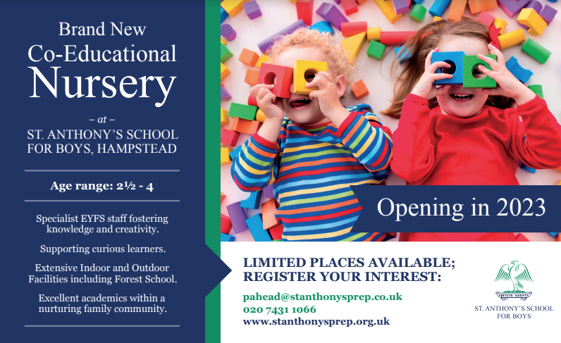 The nursery will be part of the St Anthony’s Group of nurseries accommodating boys and girls from 2.5 to 4 years of age. Nursery children will be considered for priority admission into Reception at either St Anthony’s Boys’ or Girls’ Schools.