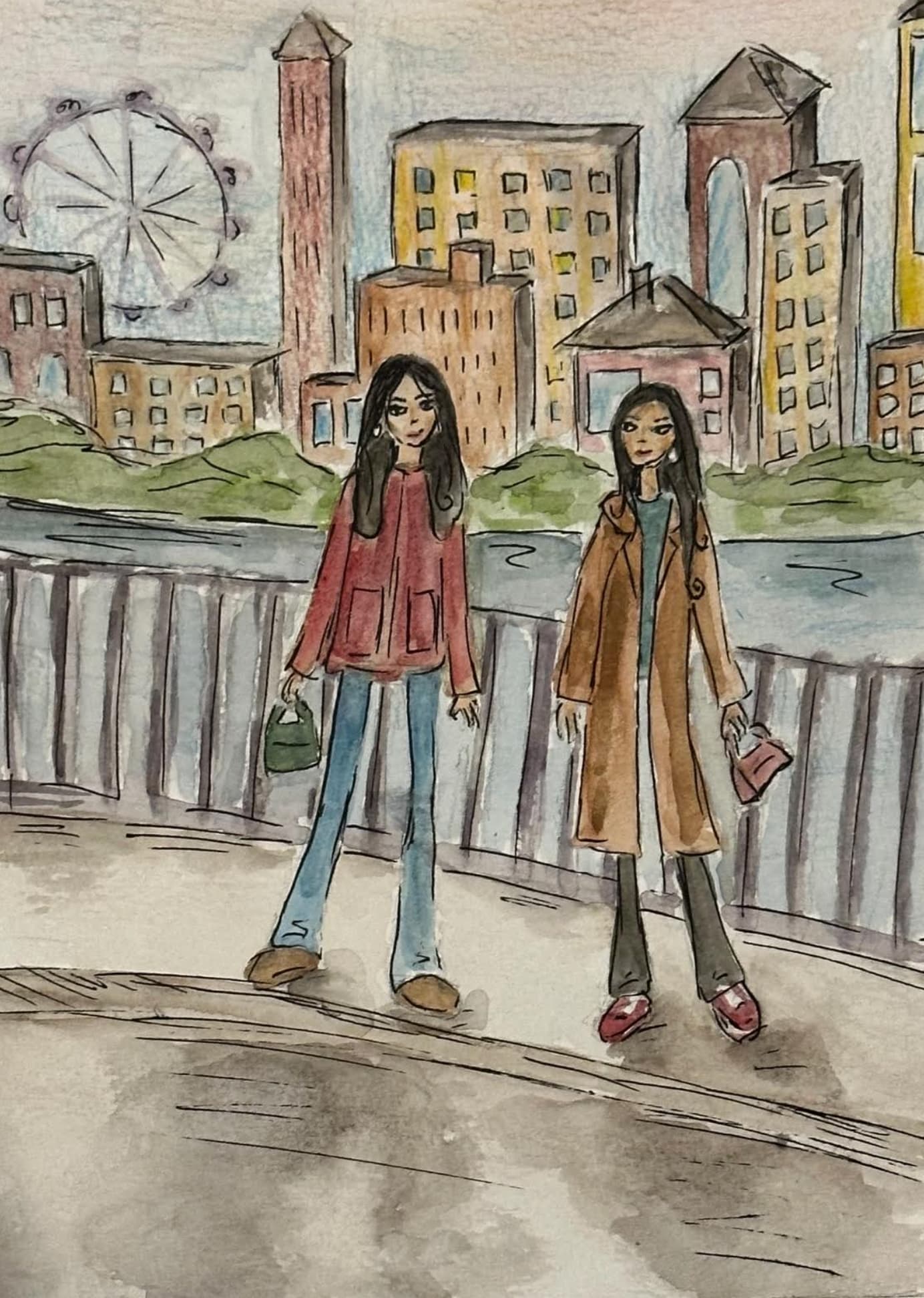 Moreover, technically, Emma Zonn’s pieces are made with such care and precision, by including many details in both the characters and the backgrounds, which brings such a bright tone of life to the paintings. I also like how they are painted rather gently with watercolour, to enhance her dreamy aesthetic, before outlining and adding in details with a black fineliner to create a balanced amount of structure in her work. I have recently been inspired by her style and her works and have attempted to create a couple of pieces with references to hers, as well as with changes to the characters to be representative of myself and my friends.