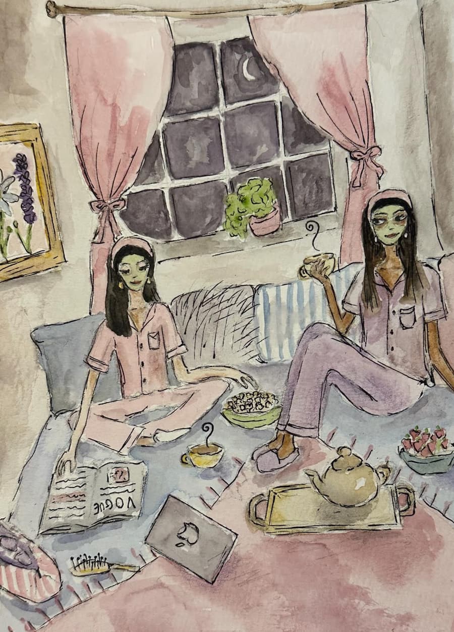 One reason why I find her work so inspiring and appealing is that it has a great sense of nostalgia from being a young girl and carefree, as she often paints them socialising and doing activities together, such as shopping, going to cafés and having sleepovers, which are relatable to myself and many others. For me, her work makes me feel as though I am being transported back into my childhood where I would have the same joy of spending time with friends, without any worries, but also implements the ways in which many teenage girls spend time with each other. The style of painting also is a reminder of the many colouring books which I had when I was smaller, centred around clothes and the art in styling them to create cohesive outfits, so her work is also a form of fashion inspiration, as she continuously paints with the current style trends in mind. As a fashion-textiles student too, I find her also very inspiring in this sense as she is very creative in how she makes her characters stand out, and also suggests their emotions without even giving them clear expressions, as they are often suggested in the art’s background and environment.